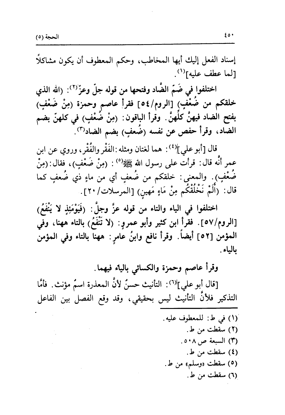 اختلفوا في ضمّ الضّاد وفتحها من قوله جلّ وعزّ «2»: (الله الذي خلقكم من ضعف) [الروم/ 54] فقرأ عاصم وحمزة من ضعف بفتح الضاد فيهنّ كلّهنّ. وقرأ الباقون: (من ضعف) في كلهنّ بضم الضاد، وقرأ حفص عن نفسه (ضعف) بضم الضاد «3».