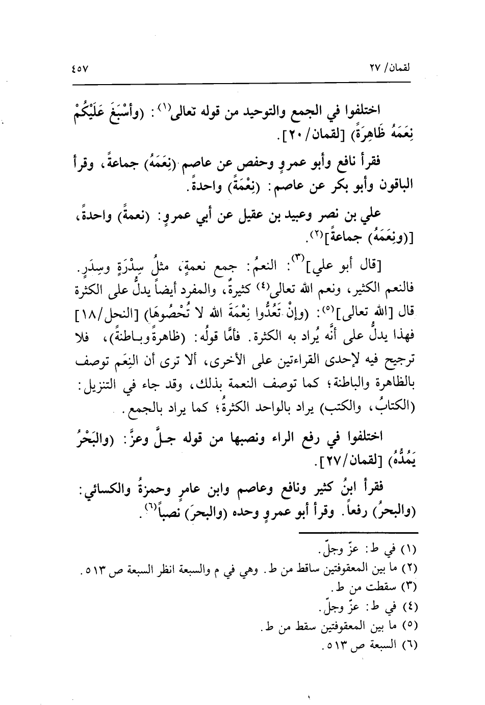 فالنعم الكثير، ونعم الله تعالى «4» كثيرة، والمفرد أيضا يدلّ على الكثرة قال [الله تعالى] «5»: وإن تعدوا نعمة الله لا تحصوها [النحل/ 18] فهذا يدلّ على أنّه يراد به الكثرة. فأمّا قوله: ظاهرة وباطنة، فلا ترجيح فيه لإحدى القراءتين على الأخرى، ألا ترى أن النعم توصف بالظاهرة والباطنة، كما توصف النعمة بذلك، وقد جاء في التنزيل:
