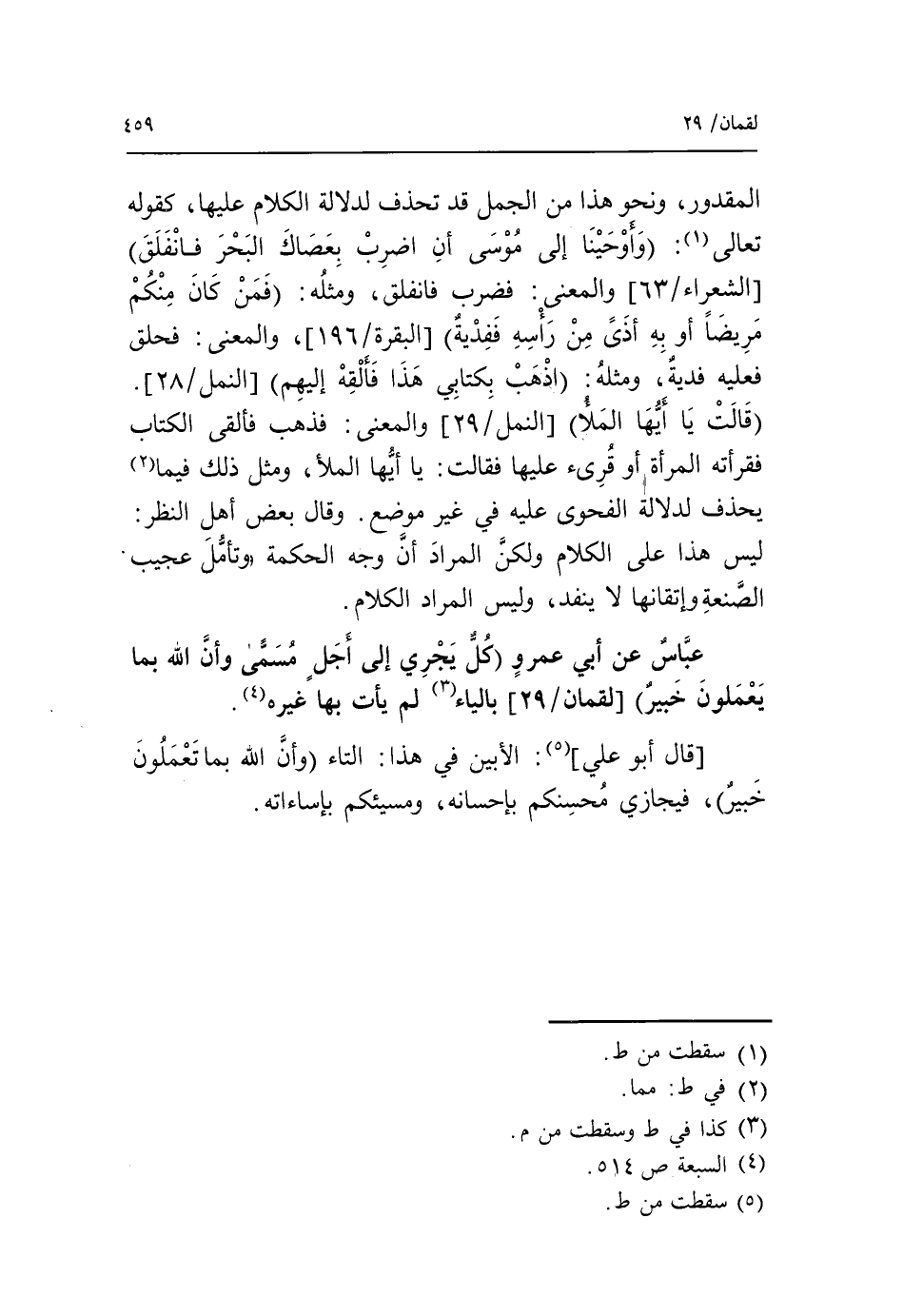 قالت يا أيها الملأ [النمل/ 29] والمعنى: فذهب فألقى الكتاب فقرأته المرأة أو قرئ عليها فقالت: يا أيّها الملأ، ومثل ذلك فيما «2» يحذف لدلالة الفحوى عليه في غير موضع. وقال بعض أهل النظر: