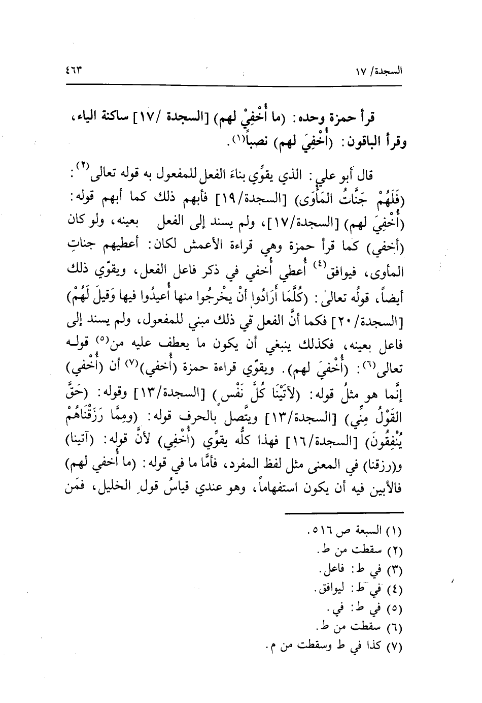 (أخفي لهم) [السجدة/ 17]، ولم يسند إلى الفعل «3» بعينه، ولو كان (أخفي) كما قرأ حمزة وهي قراءة الأعمش لكان: أعطيهم جنات المأوى، فيوافق «4» أعطي أخفي في ذكر فاعل الفعل، ويقوّي ذلك أيضا، قوله تعالى: (كلما أرادوا أن يخرجوا منها أعيدوا فيها وقيل لهم) [السجدة/ 20] فكما أنّ الفعل في ذلك مبني للمفعول، ولم يسند إلى فاعل بعينه، فكذلك ينبغي أن يكون ما يعطف عليه من «5» قوله تعالى «6»: أخفي لهم. ويقوّي قراءة حمزة أخفي «7» أن أخفي إنّما هو مثل قوله: لآتينا كل نفس [السجدة/ 13] وقوله: حق القول مني [السجدة/ 13] ويتّصل بالحرف قوله: ومما رزقناهم ينفقون [السجدة/ 16] فهذا كلّه يقوّي أخفي لأنّ قوله: آتينا ورزقنا في المعنى مثل لفظ المفرد، فأمّا ما في قوله: ما أخفي لهم فالأبين فيه أن يكون استفهاما، وهو عندي قياس قول الخليل، فمن