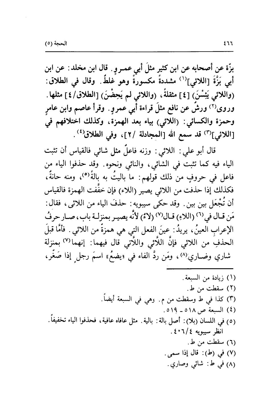 من قال في «6» (اللاء) قال «7» (لاء) لأنّه يصير بمنزلة باب، صار حرف الإعراب العين، يريد: عين الفعل التي هي همزة من اللائي. فأمّا قبل الحذف من اللائي فإنّ اللّائي واللّاتي قال فيهما: إنهما «7» بمنزلة شاري وضاري «9»، ومن ردّ الفاء في «يضع» اسم رجل إذا صغّر،