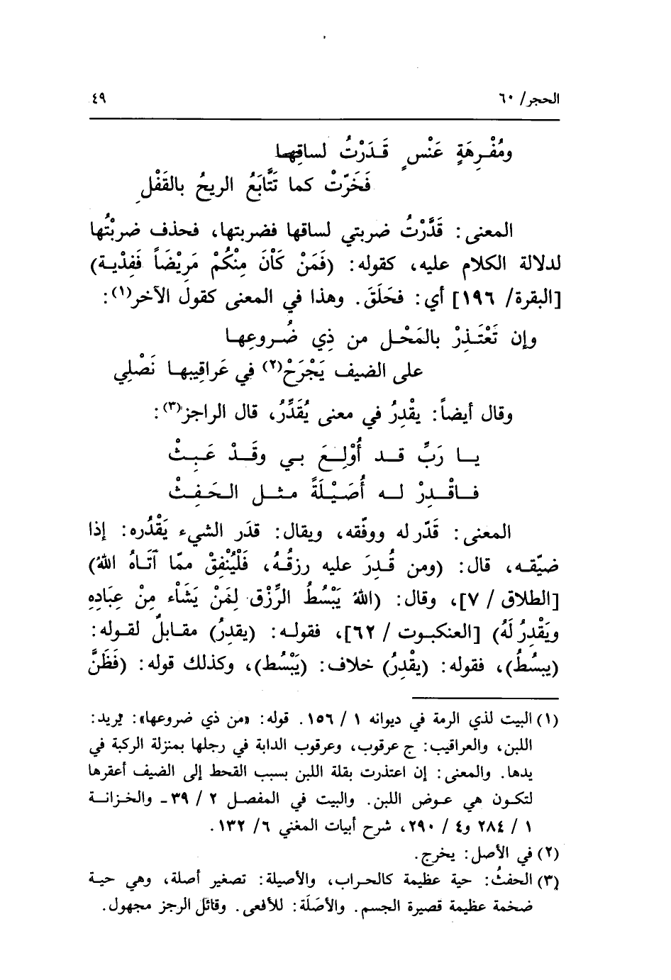 «2» في عراقيبها نصلي وقال أيضا: يقدر في معنى يقدّر، قال الراجز «3»: