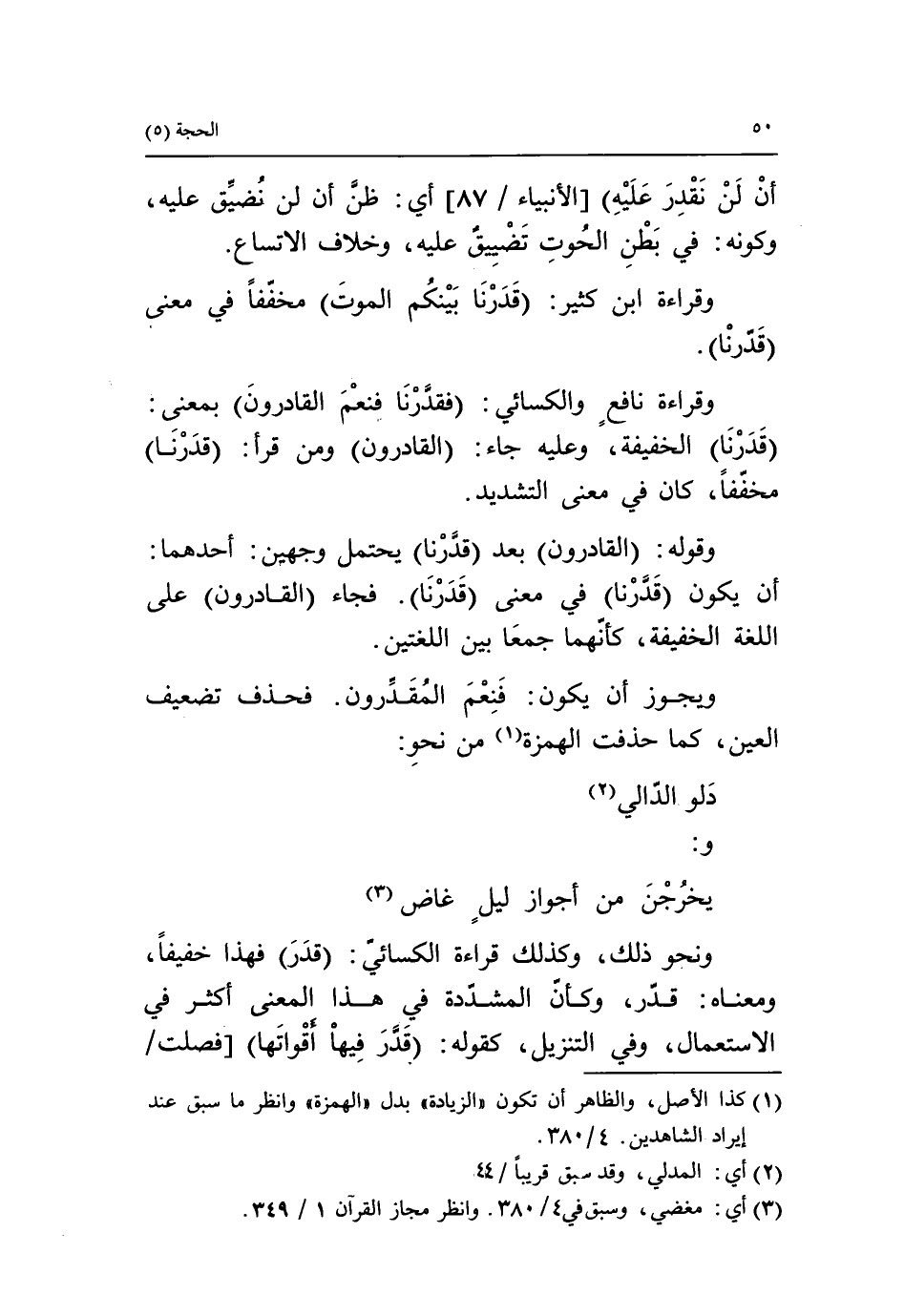 ويجوز أن يكون: فنعم المقدّرون. فحذف تضعيف العين، كما حذفت الهمزة «1» من نحو: