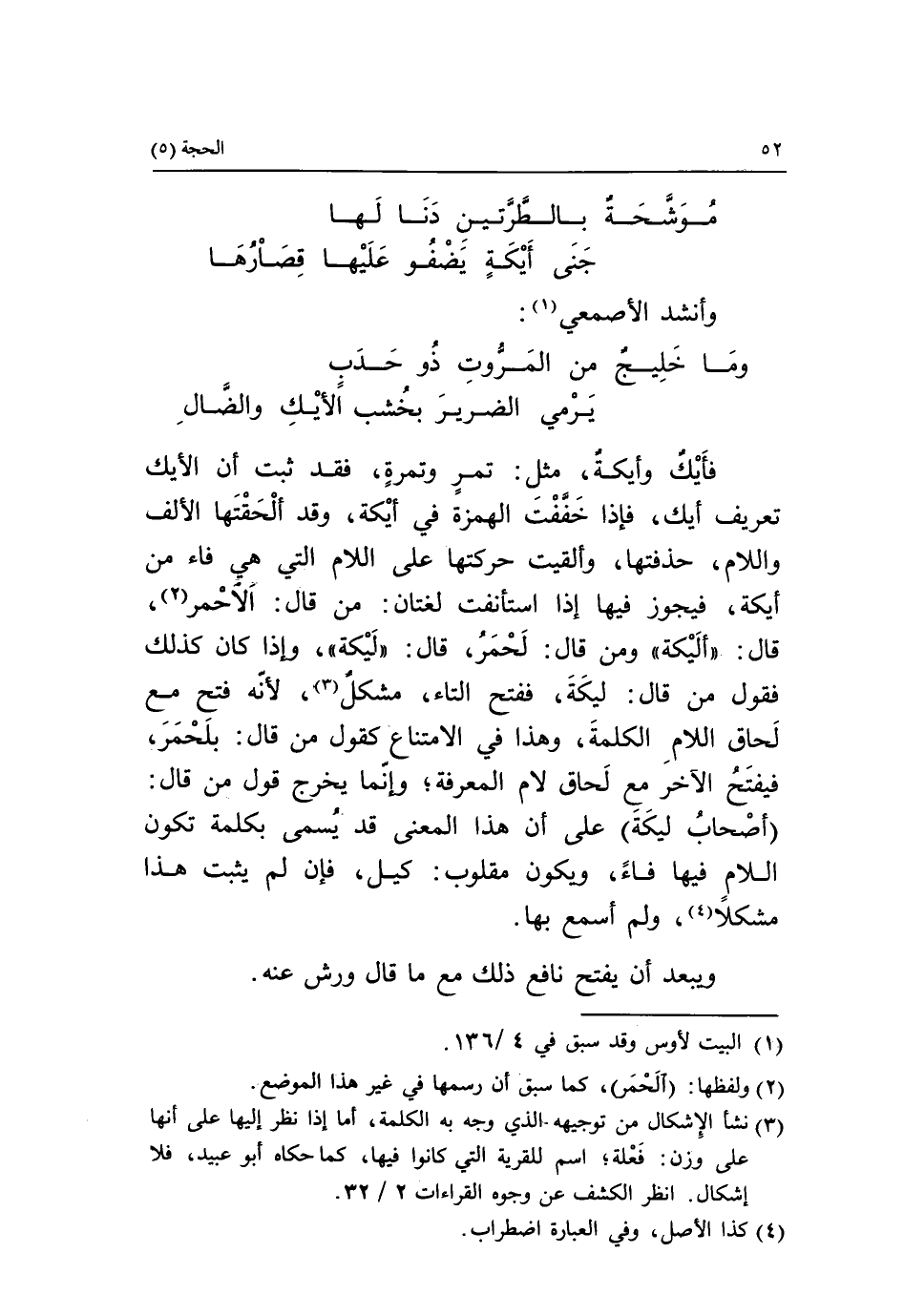 فأيك وأيكة، مثل: تمر وتمرة، فقد ثبت أن الأيك تعريف أيك، فإذا خفّفت الهمزة في أيكة، وقد ألحقتها الألف واللام، حذفتها، وألقيت حركتها على اللام التي هي فاء من أيكة، فيجوز فيها إذا استأنفت لغتان: من قال: الأحمر «2»، قال: «أليكة» ومن قال: لحمر، قال: «ليكة»، وإذا كان كذلك فقول من قال: ليكة، ففتح التاء، مشكل «3»، لأنّه فتح مع لحاق اللام الكلمة، وهذا في الامتناع كقول من قال: بلحمر، فيفتح الآخر مع لحاق لام المعرفة، وإنّما يخرج قول من قال: