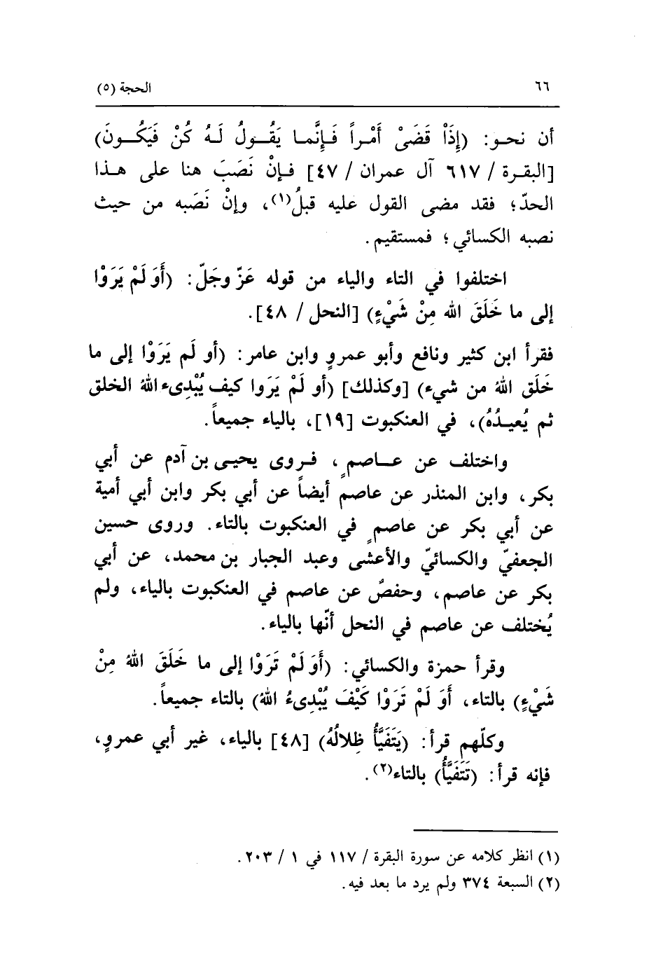 وقرأ حمزة والكسائي: (أو لم تروا إلى ما لم خلق الله من شيء) بالتاء، أولم تروا كيف يبدئ الله بالتاء جميعا.