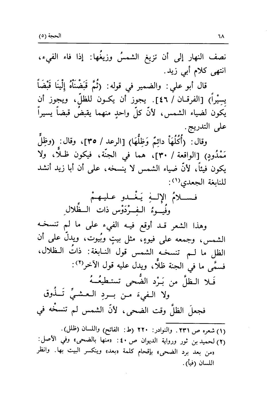 وقال: أكلها دائم وظلها [الرعد/ 35]، وقال: وظل ممدود [الواقعة/ 30]، هما في الجنّة، فيكون ظلّا، ولا يكون فيئا، لأنّ ضياء الشمس لا ينسخه، على أن أبا زيد أنشد للنابغة الجعدي «1»: