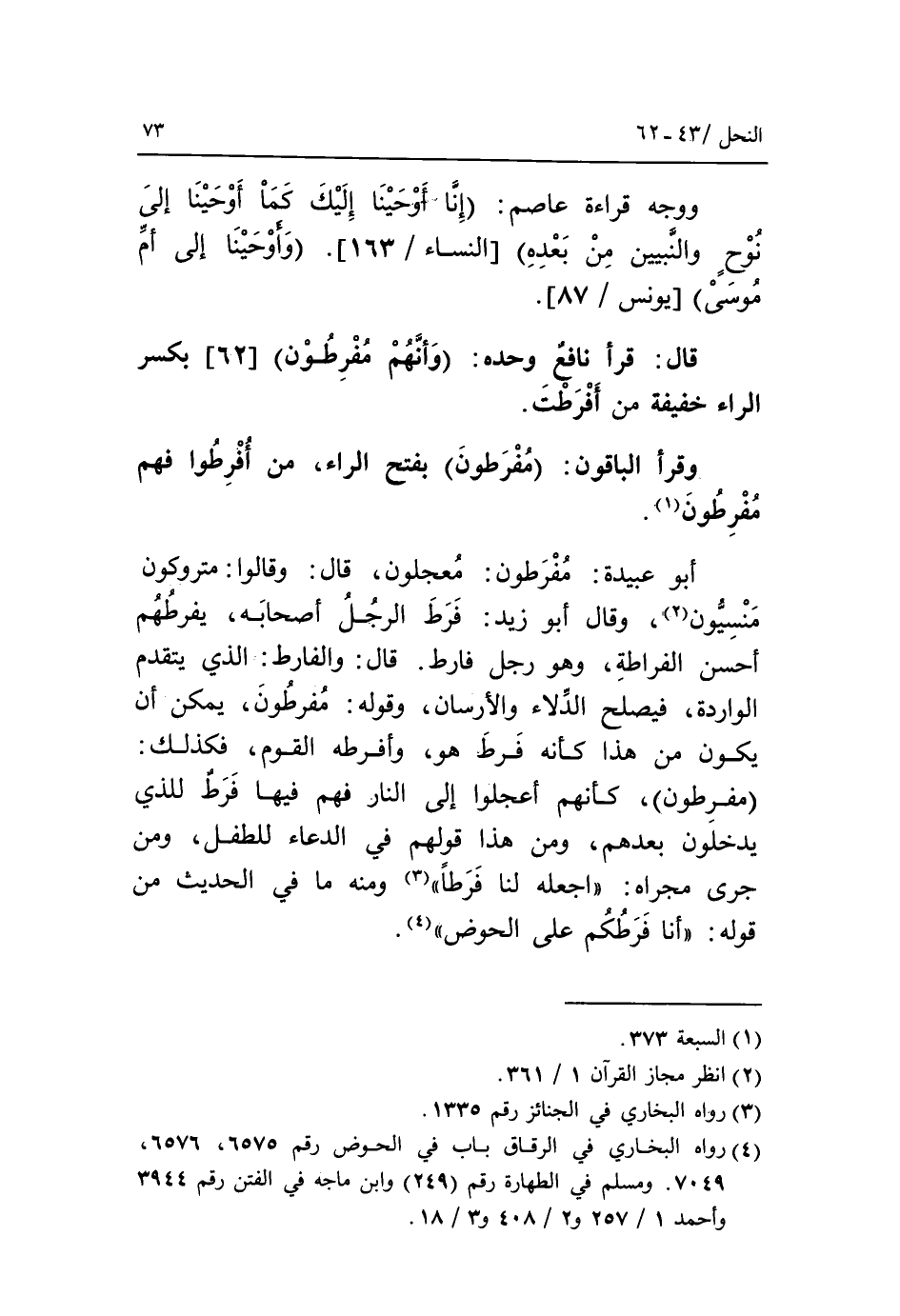 قال: قرأ نافع وحده: (وأنهم مفرطون) [62] بكسر الراء خفيفة من أفرطت.