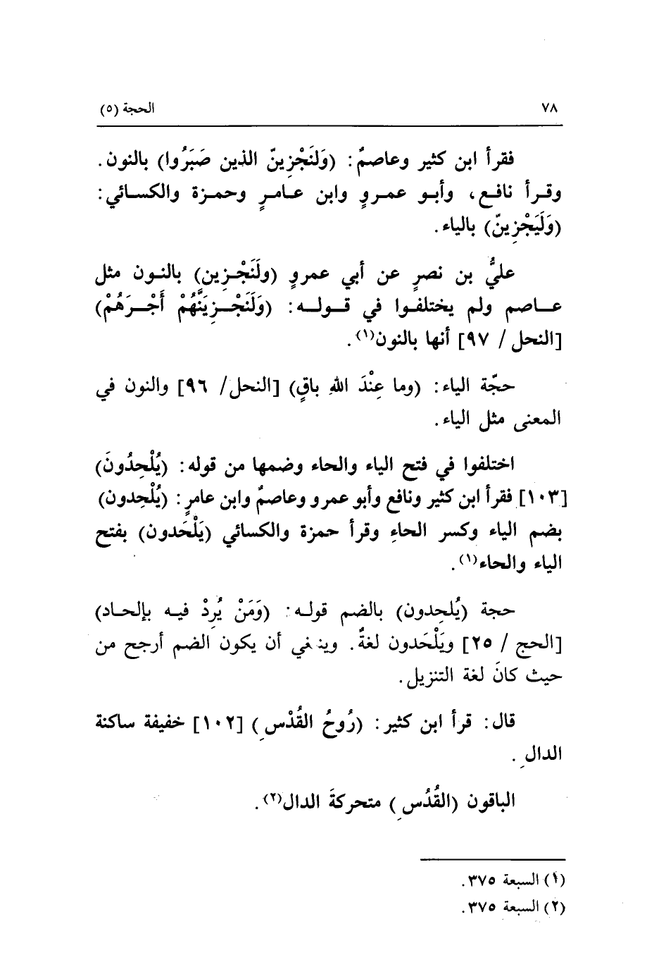 اختلفوا في فتح الياء والحاء وضمها من قوله: يلحدون [103] فقرأ ابن كثير ونافع وأبو عمرو وعاصم وابن عامر: يلحدون بضم الياء وكسر الحاء وقرأ حمزة والكسائي (يلحدون) بفتح الياء والحاء «1».