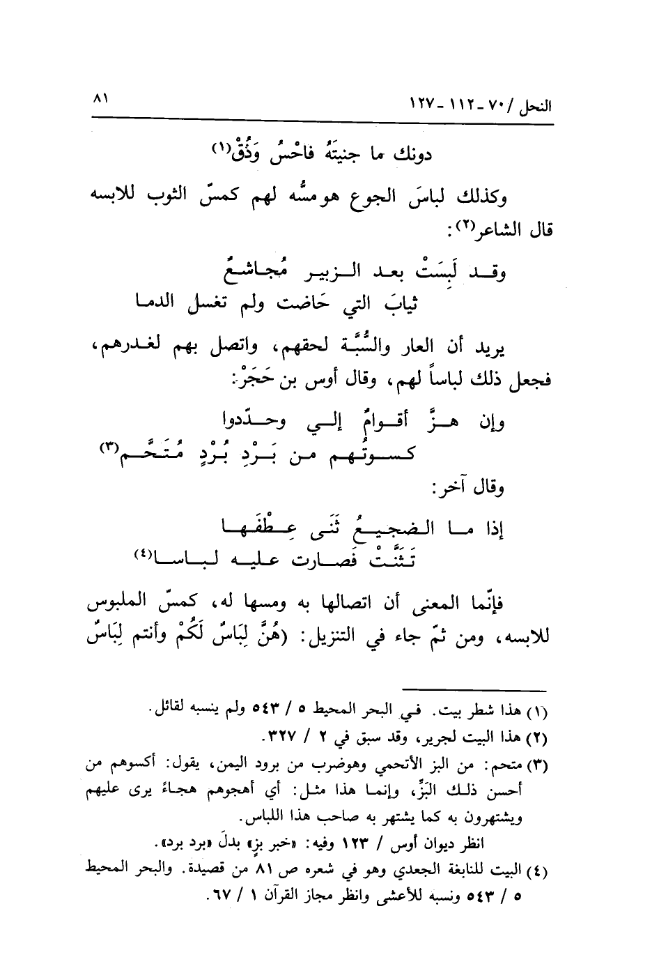 (4) البيت للنابغة الجعدي وهو في شعره ص 81 من قصيدة. والبحر المحيط 5/ 543 ونسبه للأعشى وانظر مجاز القرآن 1/ 67.