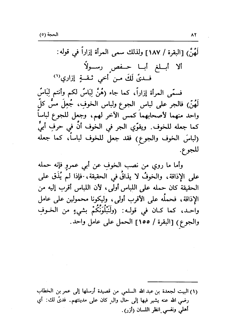 «1» فسمّى المرأة إزارا، كما جاء هن لباس لكم وأنتم لباس لهن فالجر على لباس الجوع ولباس الخوف، جعل مسّ كلّ واحد منهما لأصحابهما كمس الآخر لهم، وجعل للجوع لباسا كما جعله للخوف. ويقوّي الجر في الخوف أنّ في حرف أبيّ لباس الخوف والجوع فقد جعل للخوف لباسا، كما جعله للجوع.