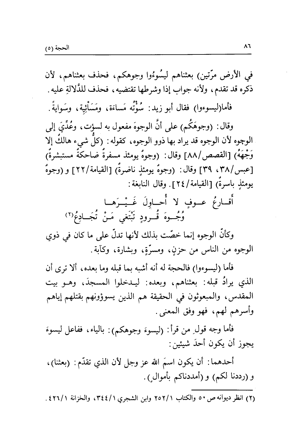 فأما ليسوءوا فالحجة له أنه أشبه بما قبله وما بعده، ألا ترى أن الذي يراد قبله: بعثناهم، وبعده: ليدخلوا المسجد، وهو بيت المقدس، والمبعوثون في الحقيقة هم الذين يسوءونهم بقتلهم إياهم وأسرهم لهم، فهو وفق المعنى.