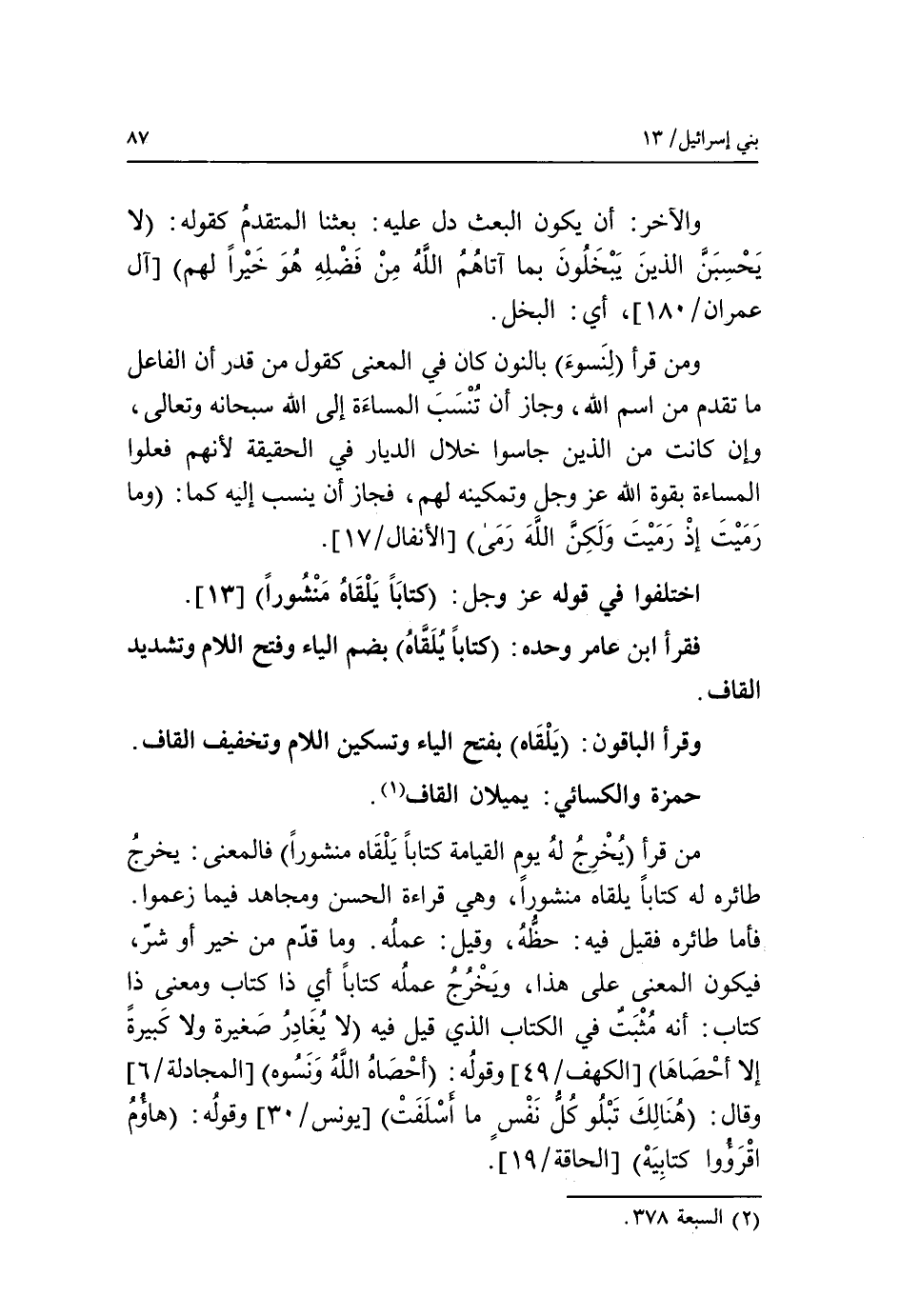 من قرأ (يخرج له يوم القيامة كتابا يلقاه منشورا) فالمعنى: يخرج طائره له كتابا يلقاه منشورا، وهي قراءة الحسن ومجاهد فيما زعموا.
