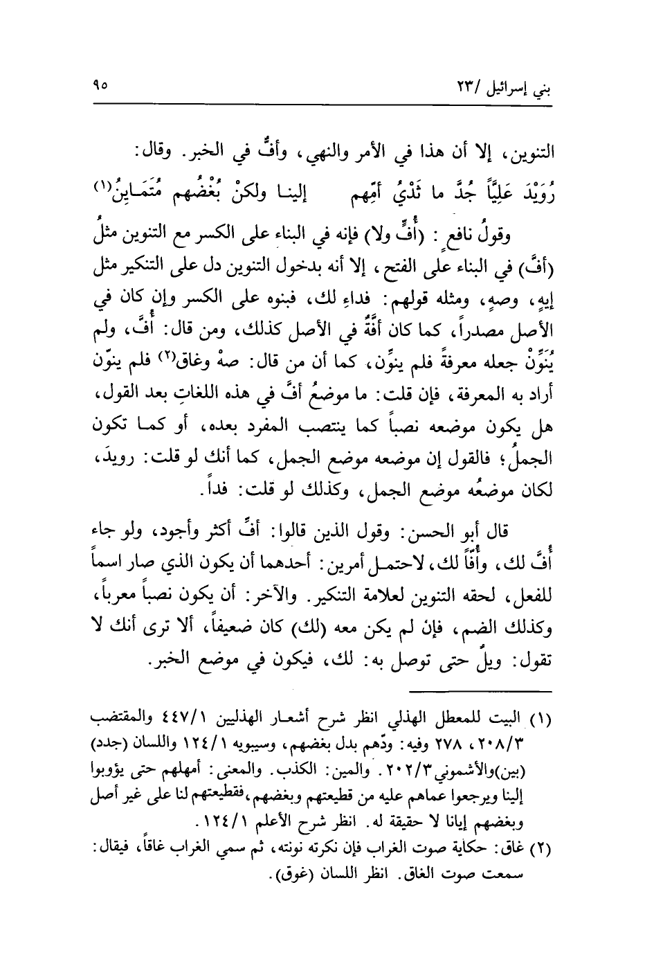 قال أبو الحسن: وقول الذين قالوا: أفّ أكثر وأجود، ولو جاء أفّ لك، وأفّا لك، لاحتمل أمرين: أحدهما أن يكون الذي صار اسما للفعل، لحقه التنوين لعلامة التنكير. والآخر: أن يكون نصبا معربا، وكذلك الضم، فإن لم يكن معه لك كان ضعيفا، ألا ترى أنك لا تقول: ويل حتى توصل به: لك، فيكون في موضع الخبر.