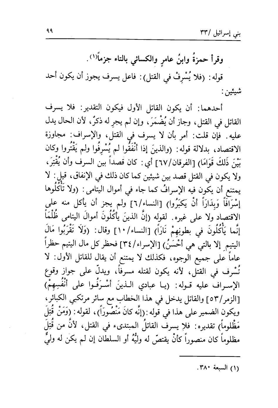 أحدهما: أن يكون القاتل الأول فيكون التقدير: فلا يسرف القاتل في القتل، وجاز أن يضمر، وإن لم يجر له ذكر، لأن الحال يدل عليه. فإن قلت: أمر بأن لا يسرف في القتل، والإسراف: مجاوزة الاقتصاد، بدلالة قوله: والذين إذا أنفقوا لم يسرفوا ولم يقتروا وكان بين ذلك قواما [الفرقان/ 67] أي: كان قصدا بين السرف وأن يقتر، ولا يكون في القتل قصد بين شيئين كما كان ذلك في الإنفاق، قيل: لا يمتنع أن يكون فيه الإسراف كما جاء في أموال اليتامى: ولا تأكلوها إسرافا وبدارا أن يكبروا [النساء/ 6] ولم يجز أن يأكل منه على الاقتصاد ولا على غيره. لقوله إن الذين يأكلون أموال اليتامى ظلما إنما يأكلون في بطونهم نارا [النساء/ 10] وقال: ولا تقربوا مال اليتيم إلا بالتي هي أحسن [الإسراء/ 34] فحظر كل مال اليتيم حظرا عاما على جميع الوجوه، فكذلك لا يمتنع أن يقال للقاتل الأول: لا تسرف في القتل، لأنه يكون لقتله مسرفا، ويدلّ على جواز وقوع الإسراف عليه قوله: يا عبادي الذين أسرفوا على أنفسهم [الزمر/ 53] والقاتل يدخل في هذا في قوله: إنه كان منصورا، لقوله: ومن قتل مظلوما تقديره: فلا يسرف القاتل المبتدئ في القتل، لأنّ من قتل مظلوما كان منصورا كأن يقتصّ له وليّه أو السلطان إن لم يكن له وليّ