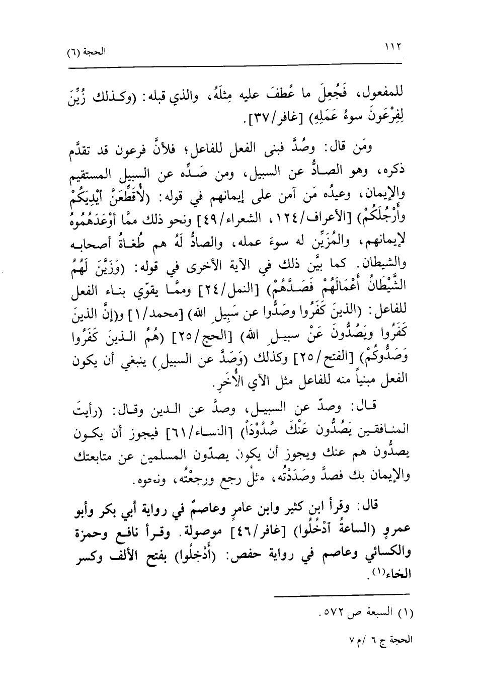 ومن قال: وصدّ فبنى الفعل للفاعل، فلأنّ فرعون قد تقدّم ذكره، وهو الصاد عن السبيل، ومن صدّه عن السبيل المستقيم والإيمان، وعيده من آمن على إيمانهم في قوله: لأقطعن أيديكم وأرجلكم [الأعراف/ 124، الشعراء/ 49] ونحو ذلك ممّا أوعدهموه لإيمانهم، والمزيّن له سوء عمله، والصادّ له هم طغاة أصحابه والشيطان. كما بيّن ذلك في الآية الأخرى في قوله: وزين لهم الشيطان أعمالهم فصدهم [النمل/ 24] وممّا يقوّي بناء الفعل للفاعل: الذين كفروا وصدوا عن سبيل الله [محمد/ 1] وإن الذين كفروا ويصدون عن سبيل الله [الحج/ 25] هم الذين كفروا وصدوكم [الفتح/ 25] وكذلك وصد عن السبيل ينبغي أن يكون الفعل مبنيا منه للفاعل مثل الآي الأخر.