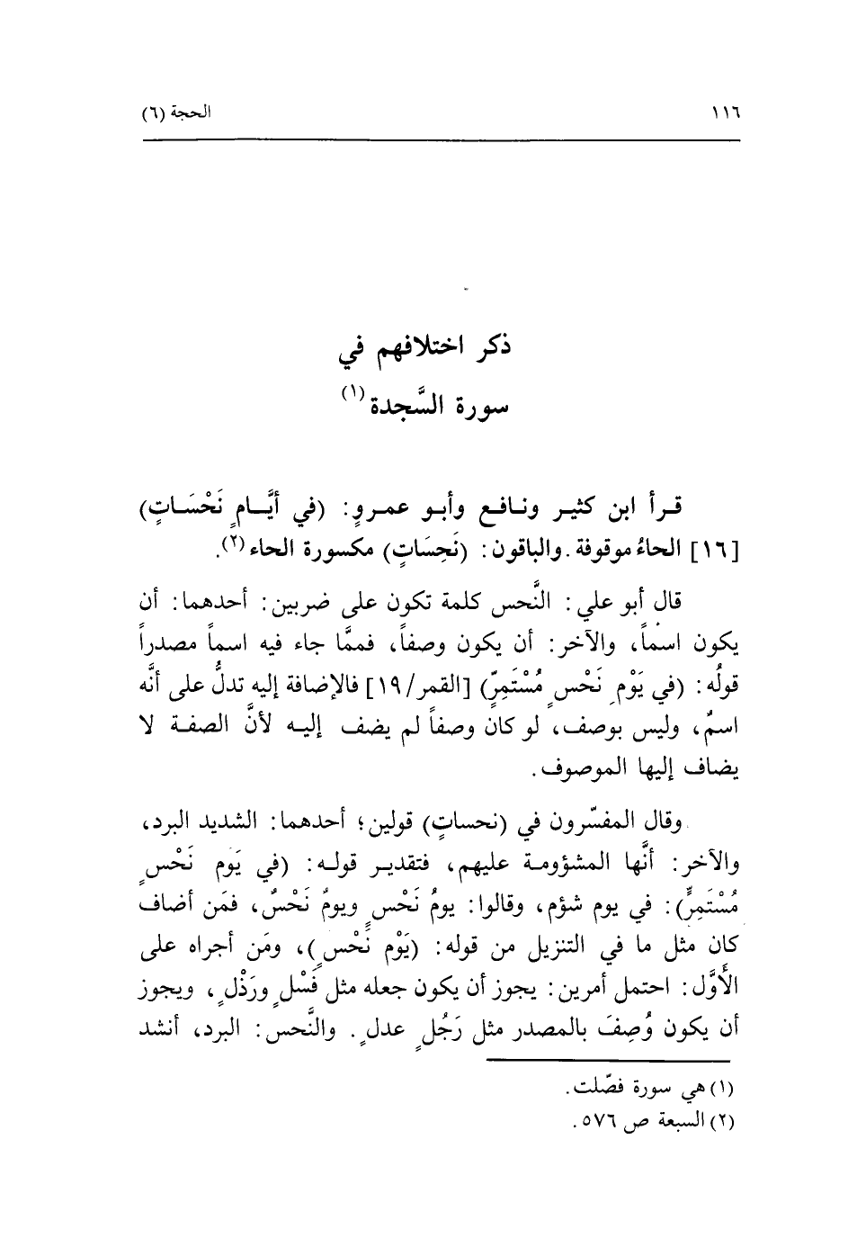 قرأ ابن كثير ونافع وأبو عمرو: في أيام نحسات [16] الحاء موقوفة. والباقون: نحسات مكسورة الحاء «2».