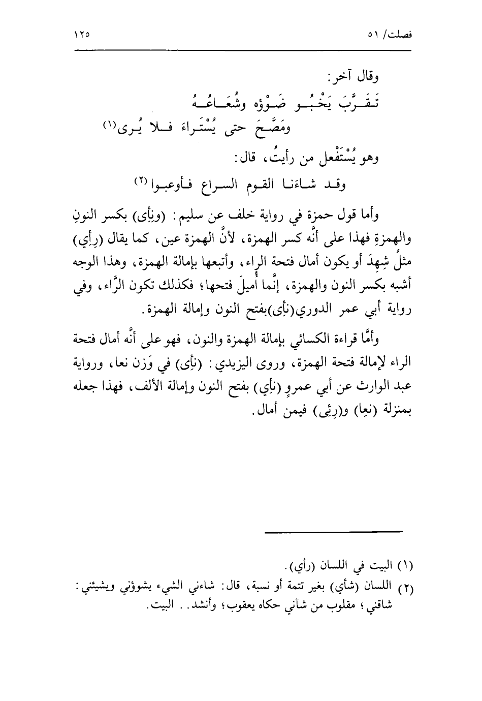 وقد شاءنا القوم السراع فأوعبوا «2» وأما قول حمزة في رواية خلف عن سليم: ونأى* بكسر النون والهمزة فهذا على أنّه كسر الهمزة، لأنّ الهمزة عين، كما يقال رأي* مثل شهد أو يكون أمال فتحة الراء، وأتبعها بإمالة الهمزة، وهذا الوجه أشبه بكسر النون والهمزة، إنّما أميل فتحها، فكذلك تكون الرّاء، وفي رواية أبي عمر الدوري نأى* بفتح النون وإمالة الهمزة.