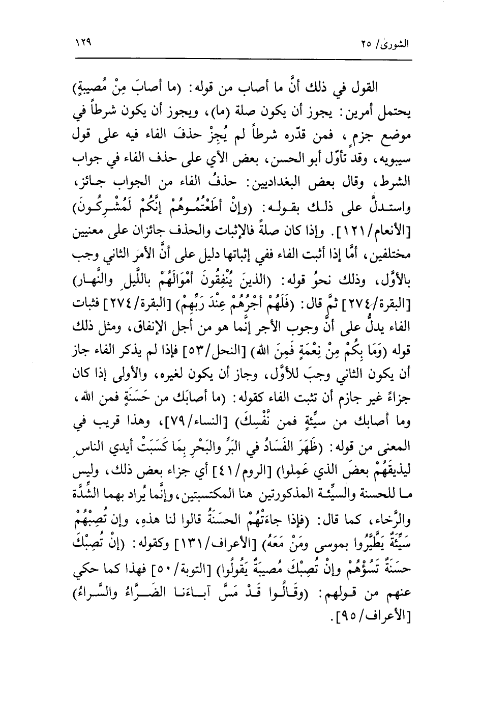 الفاء فيه على قول سيبويه، وقد تأول أبو الحسن، بعض الآي على حذف الفاء في جواب الشرط، وقال بعض البغداديين: حذف الفاء من الجواب جائز، واستدلّ على ذلك بقوله: وإن أطعتموهم إنكم لمشركون [الأنعام/ 121]. وإذا كان صلة فالإثبات والحذف جائزان على معنيين مختلفين، أمّا إذا أثبت الفاء ففي إثباتها دليل على أنّ الأمر الثاني وجب بالأوّل، وذلك نحو قوله: الذين ينفقون أموالهم بالليل والنهار [البقرة/ 274] ثمّ قال: فلهم أجرهم عند ربهم [البقرة/ 274] فثبات الفاء يدلّ على أنّ وجوب الأجر إنّما هو من أجل الإنفاق، ومثل ذلك قوله: وما بكم من نعمة فمن الله [النحل/ 53] فإذا لم يذكر الفاء جاز أن يكون الثاني وجب للأوّل، وجاز أن يكون لغيره، والأولى إذا كان جزاء غير جازم أن تثبت الفاء كقوله: ما أصابك من حسنة فمن الله، وما أصابك من سيئة فمن نفسك [النساء/ 79]، وهذا قريب في المعنى من قوله: ظهر الفساد في البر والبحر بما كسبت أيدي الناس ليذيقهم بعض الذي عملوا [الروم/ 41] أي جزاء بعض ذلك، وليس ما للحسنة والسيّئة المذكورتين هنا المكتسبتين، وإنّما يراد بهما الشّدّة والرّخاء، كما قال: فإذا جاءتهم الحسنة قالوا لنا هذه، وإن تصبهم سيئة يطيروا بموسى ومن معه [الأعراف/ 131] وكقوله: إن تصبك حسنة تسؤهم وإن تصبك مصيبة يقولوا [التوبة/ 50] فهذا كما حكي عنهم من قولهم: وقالوا قد مس آباءنا الضراء والسراء [الأعراف/ 95].