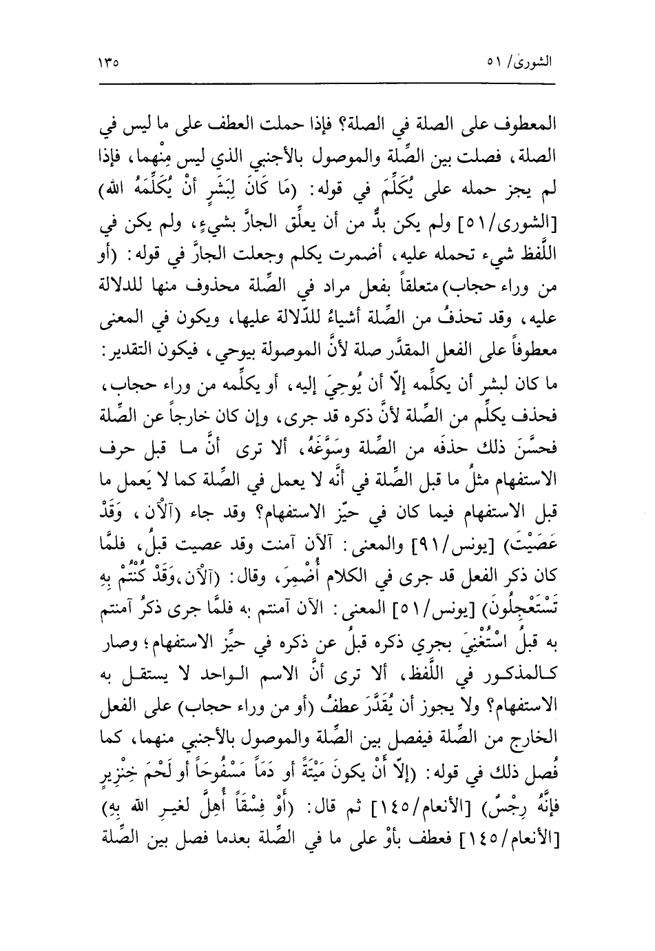 المعطوف على الصلة في الصلة؟ فإذا حملت العطف على ما ليس في الصلة، فصلت بين الصّلة والموصول بالأجنبي الذي ليس منهما، فإذا لم يجز حمله على يكلّم في قوله: ما كان لبشر أن يكلمه الله [الشورى/ 51] ولم يكن بدّ من أن يعلّق الجارّ بشيء، ولم يكن في اللّفظ شيء تحمله عليه، أضمرت يكلم وجعلت الجار في قوله: أو من وراء حجاب متعلقا بفعل مراد في الصّلة محذوف منها للدلالة عليه، وقد تحذف من الصّلة أشياء للدّلالة عليها، ويكون في المعنى معطوفا على الفعل المقدّر صلة لأن الموصولة بيوحي، فيكون التقدير: