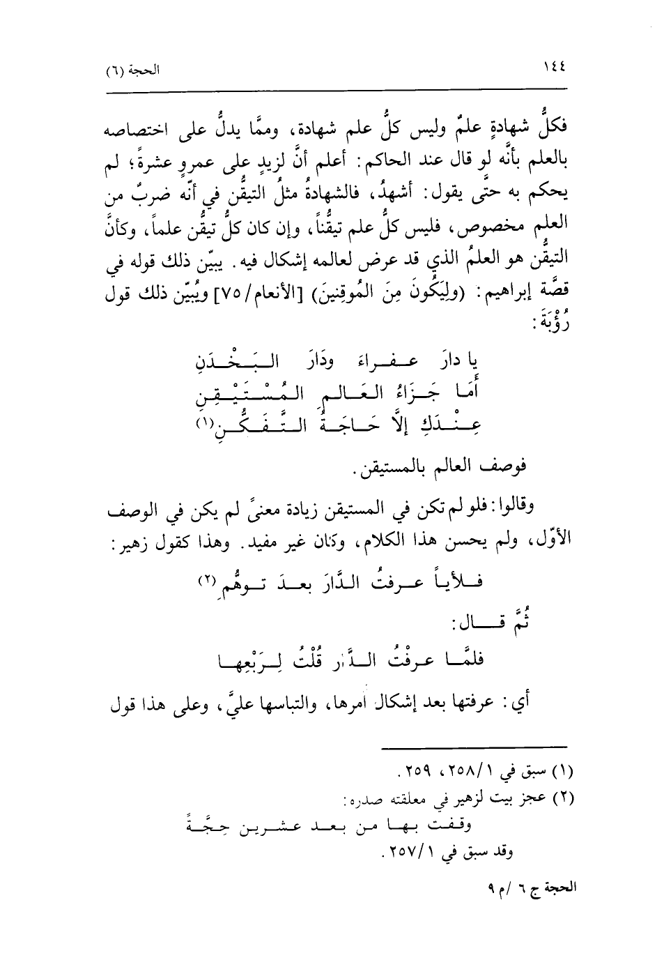 يا دار عفراء ودار البخدن أما جزاء العالم المستيقن عندك إلّا حاجة التّفكّن «1» فوصف العالم بالمستيقن.