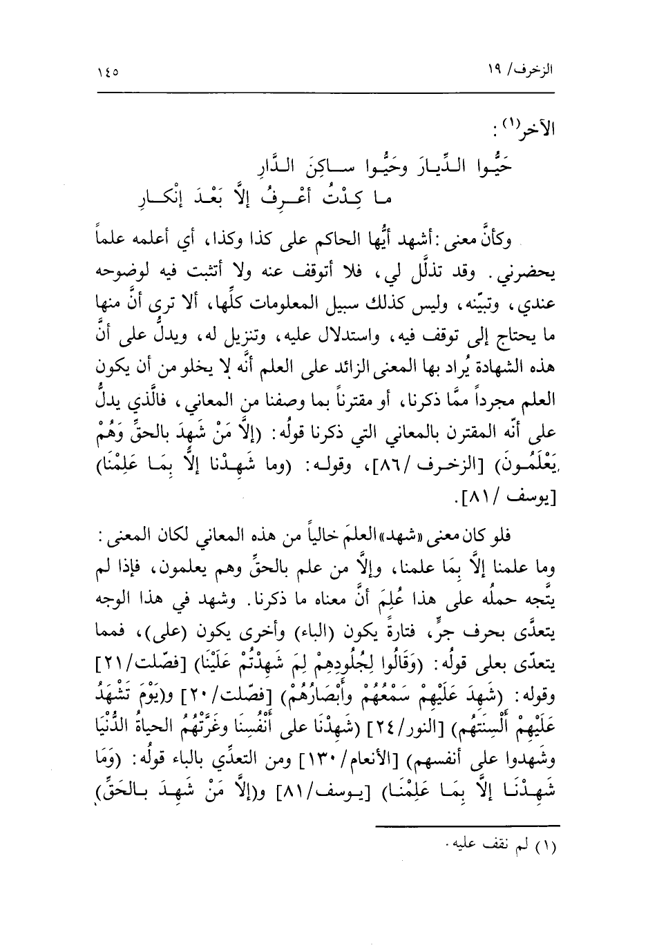 حيّوا الدّيار وحيّوا ساكن الدّار ما كدت أعرف إلّا بعد إنكار وكأنّ معنى: أشهد أيّها الحاكم على كذا وكذا، أي أعلمه علما يحضرني. وقد تذلّل لي، فلا أتوقف عنه ولا أتثبت فيه لوضوحه عندي، وتبيّنه، وليس كذلك سبيل المعلومات كلّها، ألا ترى أنّ منها ما يحتاج إلى توقف فيه، واستدلال عليه، وتنزيل له، ويدلّ على أنّ هذه الشهادة يراد بها المعنى الزائد على العلم أنّه لا يخلو من أن يكون العلم مجردا ممّا ذكرنا، أو مقترنا بما وصفنا من المعاني، فالّذي يدلّ على أنّه المقترن بالمعاني التي ذكرنا قوله: إلا من شهد بالحق وهم يعلمون [الزخرف/ 86]، وقوله: وما شهدنا إلا بما علمنا [يوسف/ 81].