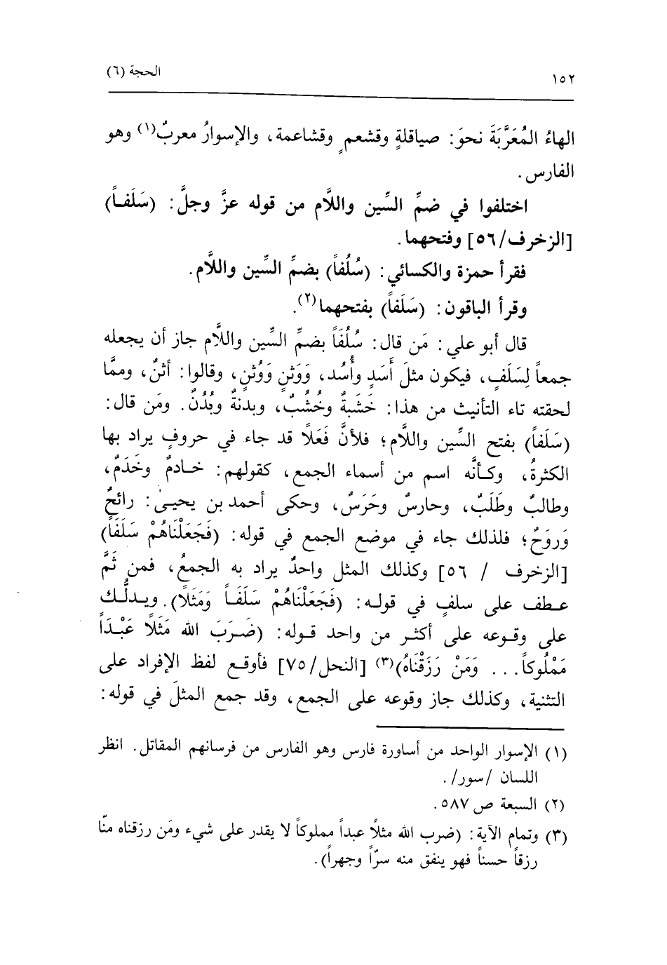 قال أبو علي: من قال: سلفا بضمّ السّين واللّام جاز أن يجعله جمعا لسلف، فيكون مثل أسد وأسد، ووثن وقالوا: أثن، وممّا لحقته تاء التأنيث من هذا: خشبة وخشب، وبدنة وبدن. ومن قال: