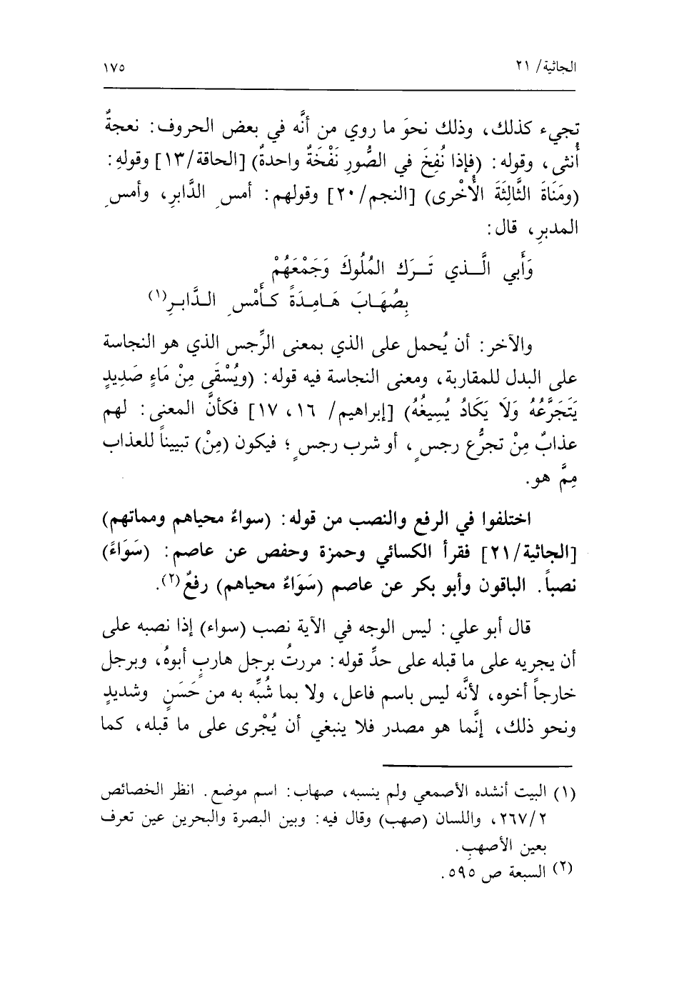 قال أبو علي: ليس الوجه في الآية نصب سواء إذا نصبه على أن يجريه على ما قبله على حدّ قوله: مررت برجل هارب أبوه، وبرجل خارجا أخوه، لأنّه ليس باسم فاعل، ولا بما شبّه به من حسن وشديد ونحو ذلك، إنّما هو مصدر فلا ينبغي أن يجرى على ما قبله، كما