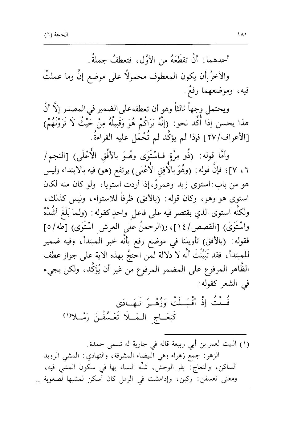 وأمّا قوله: ذو مرة فاستوى وهو بالأفق الأعلى [النجم/ 6، 7]، فإنّ قوله: وهو بالافق الأعلى يرتفع هو فيه بالابتداء وليس هو من باب: استوى زيد وعمرو، إذا أردت استويا، ولو كان منه لكان استوى هو وهو، وكان قوله: بالأفق ظرفا للاستواء، وليس كذلك، ولكنّه استوى الذي يقتصر فيه على فاعل واحد كقوله: ولما بلغ أشده واستوى [القصص/ 14]، والرحمن على العرش استوى [طه/ 5] فقوله: بالأفق تأويلنا في موضع رفع بأنّه خبر المبتدأ، وفيه ضمير للمبتدإ، فقد تبيّنت أنّه لا دلالة لمن احتجّ بهذه الآية على جواز عطف الظّاهر المرفوع على المضمر المرفوع من غير أن يؤكّد، ولكن يجيء في الشعر كقوله: