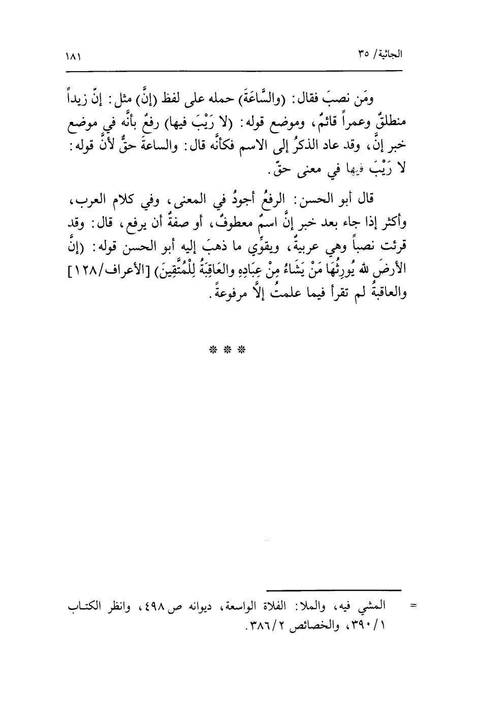 قال أبو الحسن: الرفع أجود في المعنى، وفي كلام العرب، وأكثر إذا جاء بعد خبر إنّ اسم معطوف، أو صفة أن يرفع، قال: وقد قرئت نصبا وهي عربية، ويقوّي ما ذهب إليه أبو الحسن قوله: إن الأرض لله يورثها من يشاء من عباده والعاقبة للمتقين [الأعراف/ 128] والعاقبة لم تقرأ فيما علمت إلّا مرفوعة.