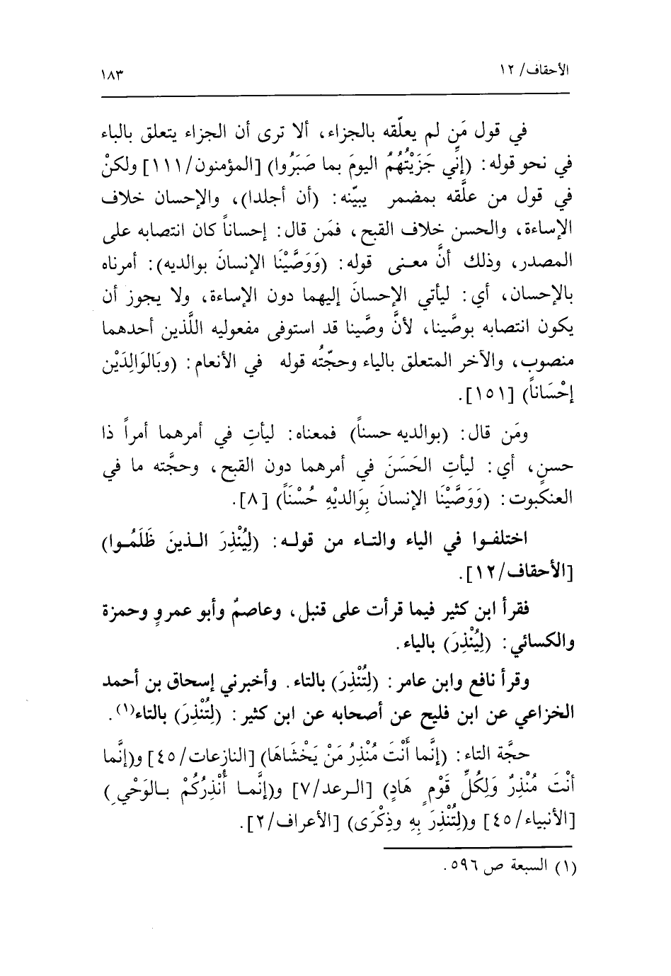 ومن قال: بوالديه حسنا فمعناه: ليأت في أمرهما أمرا ذا حسن، أي: ليأت الحسن في أمرهما دون القبح، وحجّته ما في العنكبوت: ووصينا الإنسان بوالدين حسنا [8].