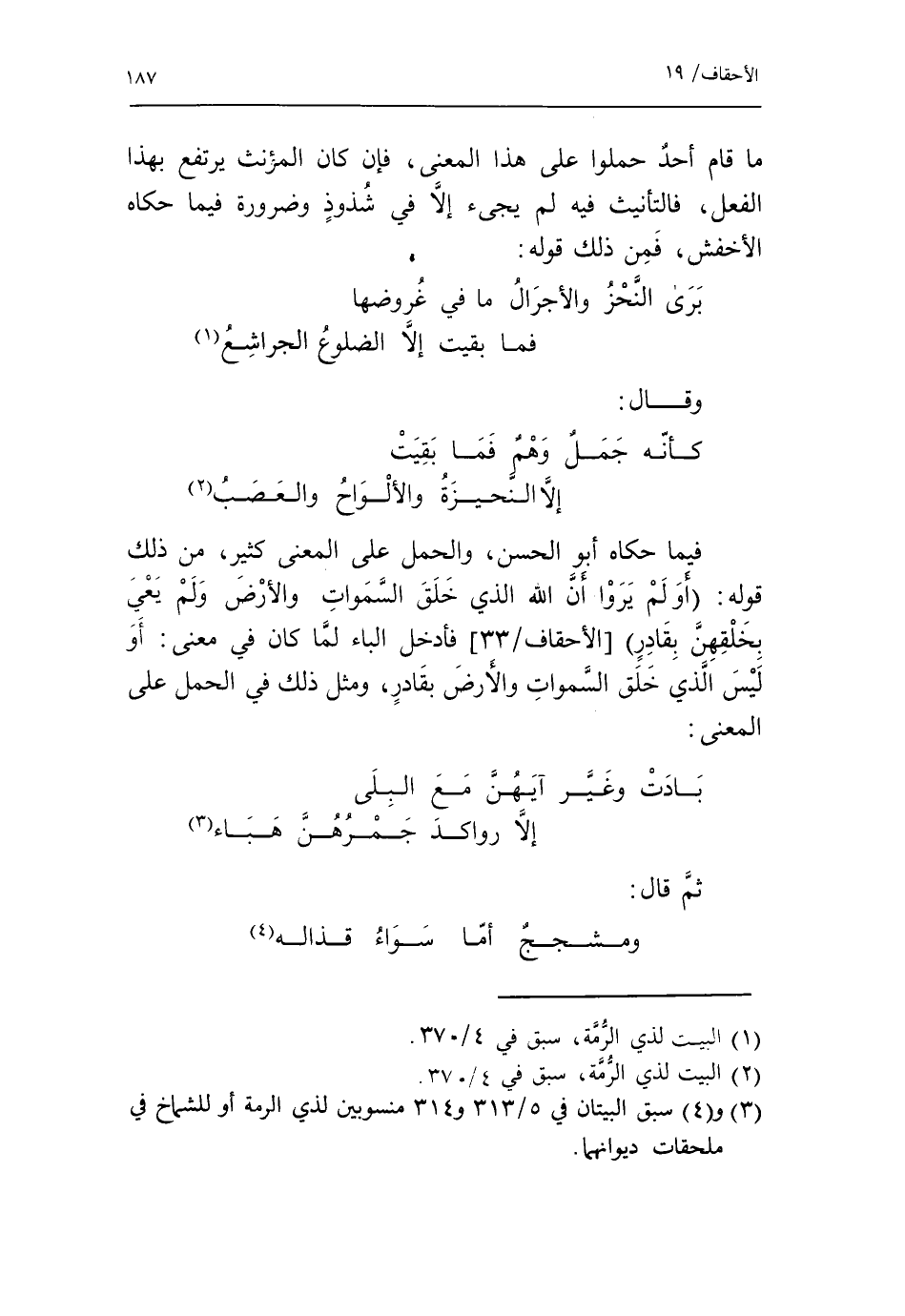 (3) سبق البيتان في 5/ 313 و 314 منسوبين لذي الرمة أو للشماخ في ملحقات ديوانهما.