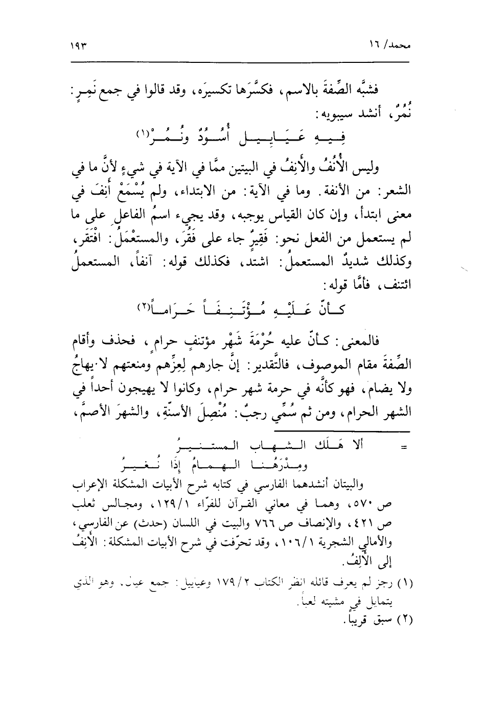 كأنّ عليه مؤتنفا حراما «2» فالمعنى: كأنّ عليه حرمة شهر مؤتنف حرام، فحذف وأقام الصّفة مقام الموصوف، فالتّقدير: إنّ جارهم لعزّهم ومنعتهم لا يهاج ولا يضام، فهو كأنّه في حرمة شهر حرام، وكانوا لا يهيجون أحدا في الشهر الحرام، ومن ثم سمّي رجب: منصل الأسنّة، والشهر الأصمّ،