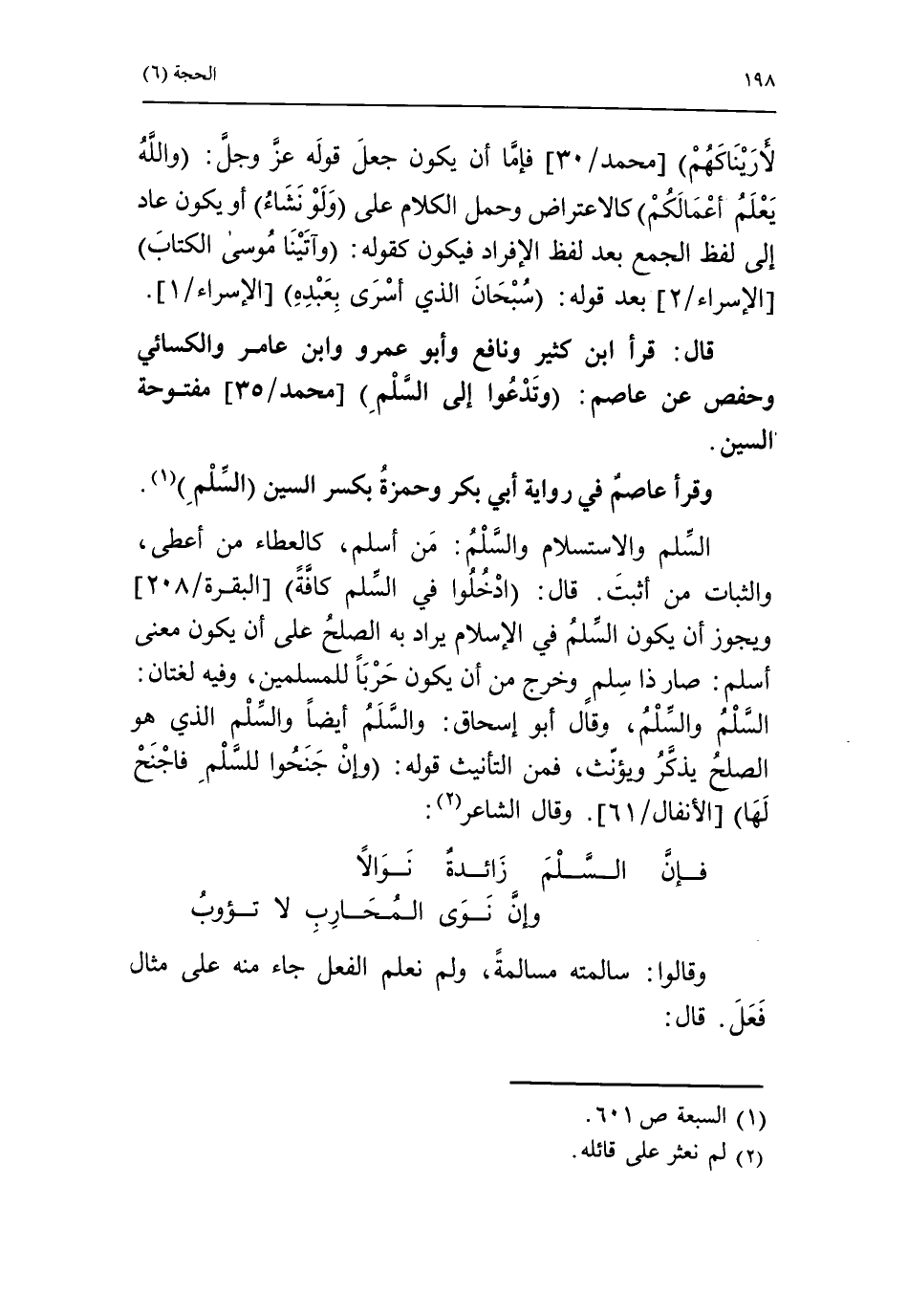 قال: قرأ ابن كثير ونافع وأبو عمرو وابن عامر والكسائي وحفص عن عاصم: وتدعوا إلى السلم [محمد/ 35] مفتوحة السين.