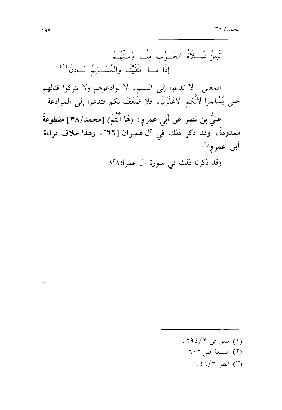 تبين صلاة الحرب منّا ومنهم إذا ما التقينا والمسالم بادن «1» المعنى: لا تدعوا إلى السلم، لا توادعوهم ولا تتركوا قتالهم حتى يسلموا لأنّكم الأعلون، فلا ضعف بكم فتدعوا إلى الموادعة.