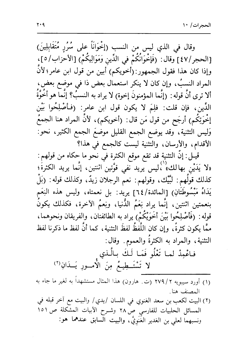 «لا يدين بها لك» «1»، ليس يريد نفي قوّتين اثنتين، إنّما يريد الكثرة، كذلك قولهم: لبّيك، وقولهم: نعم الرجلان زيد، وكذلك قوله: بل يداه مبسوطتان [المائدة/ 64] يريد: بل نعمتاه، وليس هذه النعم بنعمتين اثنتين، إنما يراد نعم الدّنيا، ونعم الآخرة، فكذلك يكون قوله: فأصلحوا بين أخويكم يراد به الطائفتان، والفريقان ونحوهما، ممّا يكون كثرة، وإن كان اللّفظ لفظ التثنية، كما أنّ لفظ ما ذكرنا لفظ التثنية، والمراد به الكثرة والعموم. وقال: