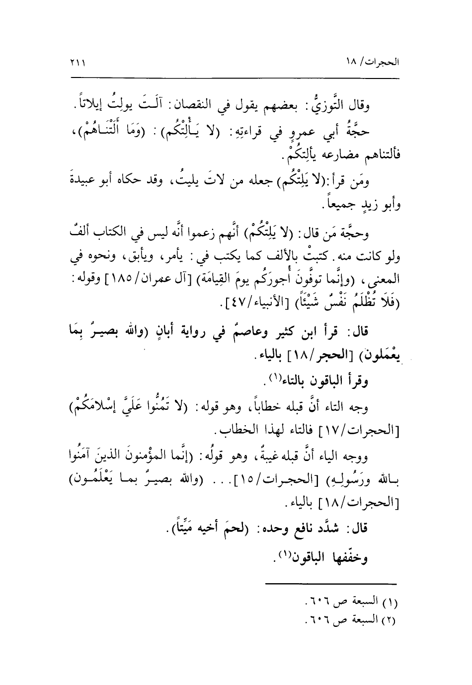 وحجّة من قال: لا يلتكم أنّهم زعموا أنّه ليس في الكتاب ألف ولو كانت منه. كتبت بالألف كما يكتب في: يأمر، ويأبق، ونحوه في المعنى، وإنما توفون أجوركم يوم