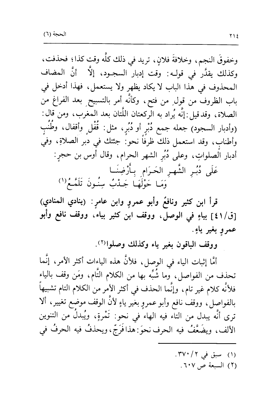 أمّا إثبات الياء في الوصل، فلأنّ هذه الياءات أكثر الأمر، إنّما تحذف من الفواصل، وما شبّه بها من الكلام التّام، ومن وقف بالياء فلأنّه كلام غير تام، وإنّما الحذف في أكثر الأمر من الكلام التام تشبيها بالفواصل، ووقف نافع وأبو عمرو بغير ياء لأنّ الوقف موضع تغيير، ألا ترى أنّه يبدل من التاء فيه الهاء في نحو: تمرة، ويبدل من التنوين الألف، ويضعّف فيه الحرف نحو: هذا فرجّ، ويحذف فيه الحرف في