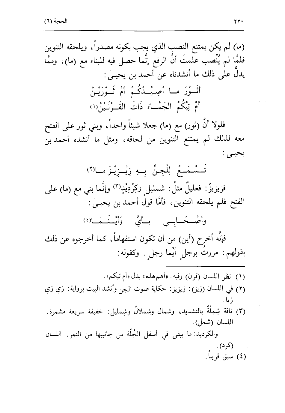 تسمع للجنّ به زيزيز ما «2» فزيزيز: فعليل مثل: شمليل وكرديد «3» وإنّما بني مع ما* على الفتح فلم يلحقه التنوين، فأمّا قول أحمد بن يحيى:
