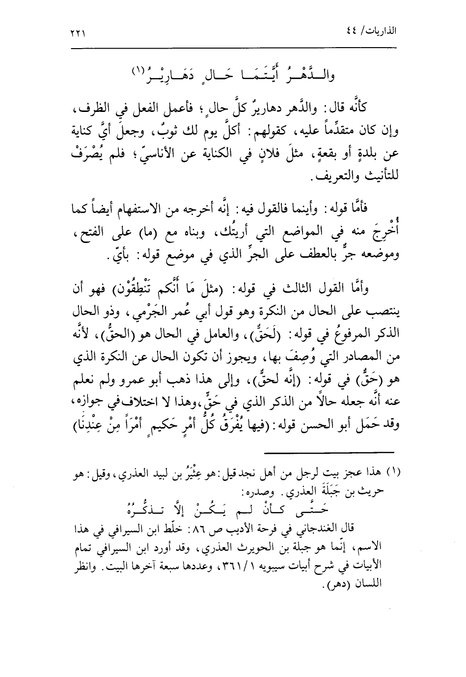 وأمّا القول الثالث في قوله: مثل ما أنكم تنطقون فهو أن ينتصب على الحال من النكرة وهو قول أبي عمر الجرمي، وذو الحال الذكر المرفوع في قوله: لحق، والعامل في الحال هو الحق*، لأنّه من المصادر التي وصف بها، ويجوز أن تكون الحال عن النكرة الذي هو حق* في قوله: إنه لحق، وإلى هذا ذهب أبو عمرو ولم نعلم عنه أنّه جعله حالا من الذكر الذي في حقّ، وهذا لا اختلاف في جوازه، وقد حمل أبو الحسن قوله: فيها يفرق كل أمر حكيم أمرا من عندنا