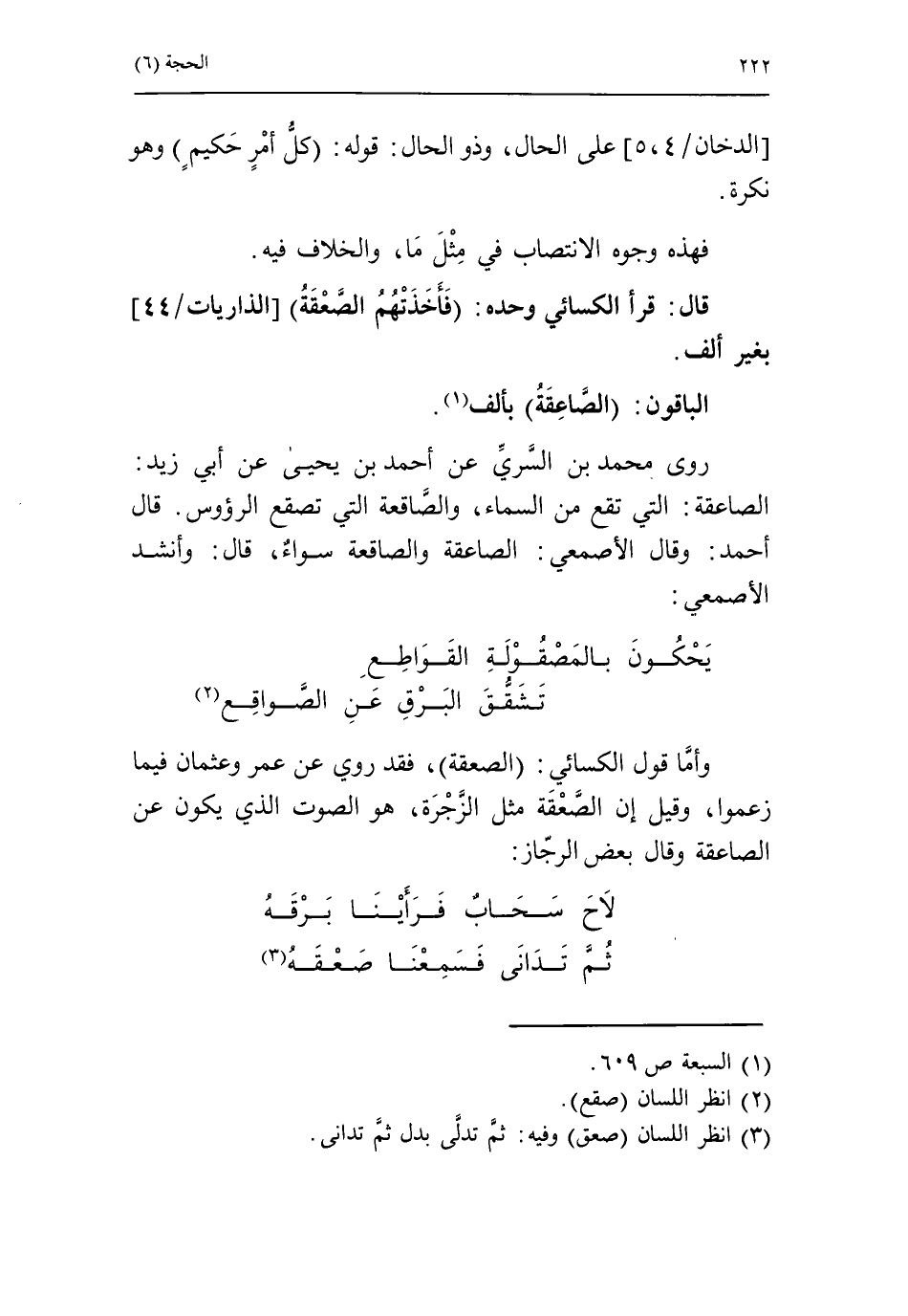 يحكون بالمصقولة القواطع تشقّق البرق عن الصّواقع «2» وأمّا قول الكسائي: الصعقة، فقد روي عن عمر وعثمان فيما زعموا، وقيل إن الصّعقة مثل الزّجرة، هو الصوت الذي يكون عن الصاعقة وقال بعض الرجاز:
