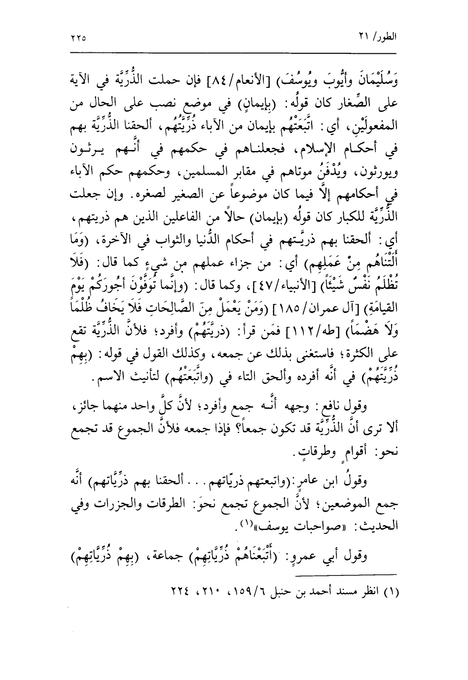 وسليمان وأيوب ويوسف [الأنعام/ 84] فإن حملت الذّرّيّة في الآية على الصّغار كان قوله: بإيمان في موضع نصب على الحال من المفعولين، أي: اتّبعتهم بإيمان من الآباء ذرّيّتهم، ألحقنا الذّرّيّة بهم في أحكام الإسلام، فجعلناهم في حكمهم في أنّهم يرثون ويورثون، ويدفن موتاهم في مقابر المسلمين، وحكمهم حكم الآباء في أحكامهم إلّا فيما كان موضوعا عن الصغير لصغره. وإن جعلت الذّرّيّة للكبار كان قوله بإيمان حالا من الفاعلين الذين هم ذريتهم، أي: ألحقنا بهم ذريّتهم في أحكام الدّنيا والثواب في الآخرة، وما ألتناهم من عملهم أي: من جزاء عملهم من شيء كما قال: فلا تظلم نفس شيئا [الأنبياء/ 47]، وكما قال: وإنما توفون أجوركم يوم القيامة [آل عمران/ 185] ومن يعمل من الصالحات فلا يخاف ظلما ولا هضما [طه/ 112] فمن قرأ: ذريتهم* وأفرد، فلأنّ الذّرّيّة تقع على الكثرة، فاستغنى بذلك عن جمعه، وكذلك القول في قوله: بهم