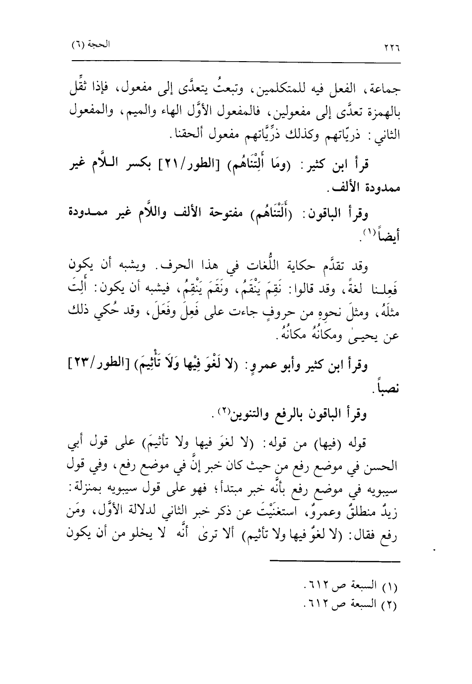 وقرأ ابن كثير وأبو عمرو: لا لغو فيها ولا تأثيم [الطور/ 23] نصبا.