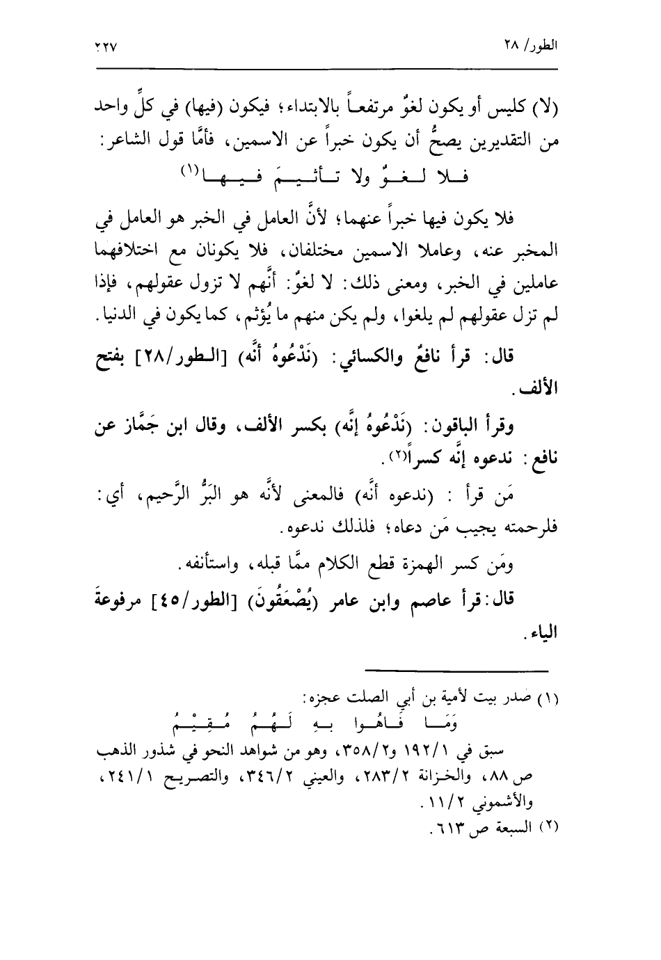 فلا لغو ولا تأثيم فيها «1» فلا يكون فيها خبرا عنهما، لأن العامل في الخبر هو العامل في المخبر عنه، وعاملا الاسمين مختلفان، فلا يكونان مع اختلافهما عاملين في الخبر، ومعنى ذلك: لا لغو: أنّهم لا تزول عقولهم، فإذا لم تزل عقولهم لم يلغوا، ولم يكن منهم ما يؤثم، كما يكون في الدنيا.