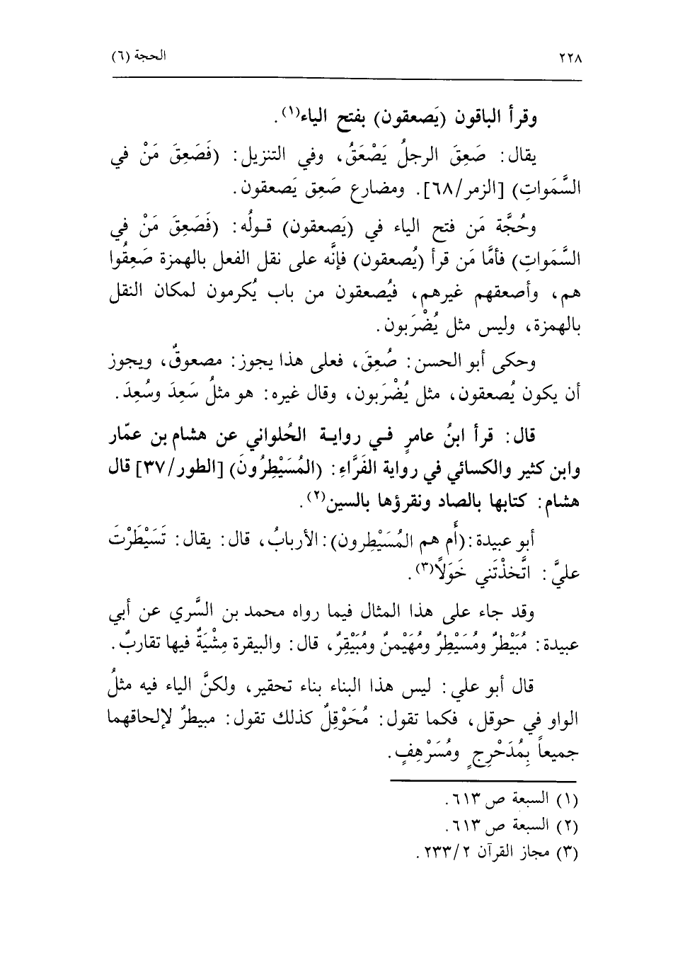 وحجّة من فتح الياء في يصعقون قوله: فصعق من في السموات فأمّا من قرأ يصعقون فإنّه على نقل الفعل بالهمزة صعقوا هم، وأصعقهم غيرهم، فيصعقون من باب يكرمون لمكان النقل بالهمزة، وليس مثل يضربون.