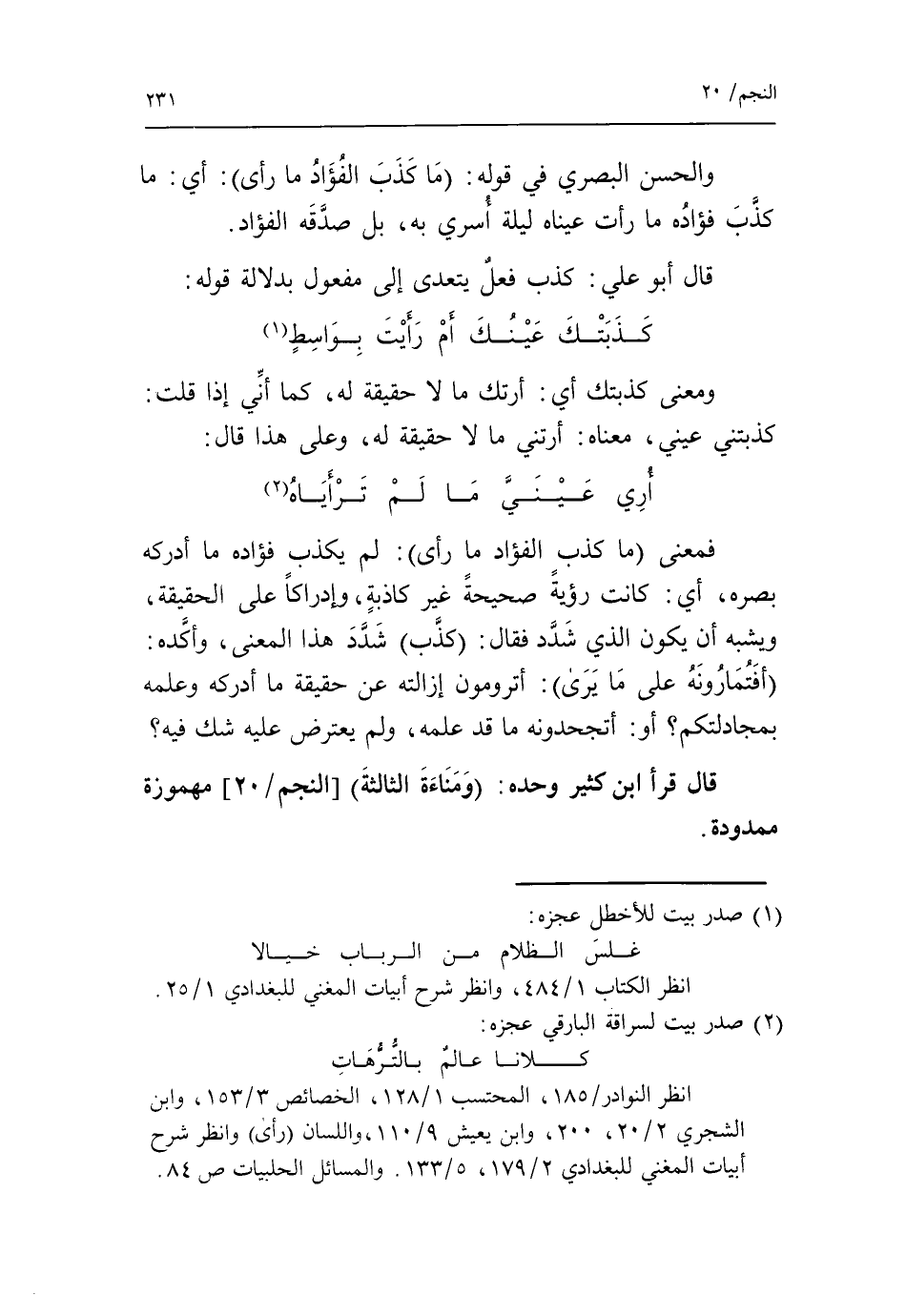 أري عينيّ ما لم ترأياه «2» فمعنى ما كذب الفؤاد ما رأى: لم يكذب فؤاده ما أدركه بصره، أي: كانت رؤية صحيحة غير كاذبة، وإدراكا على الحقيقة، ويشبه أن يكون الذي شدّد فقال: كذب* شدّد هذا المعنى، وأكّده: