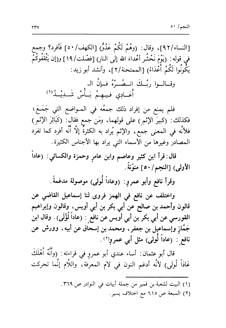 قال أبو عثمان: أساء عندي أبو عمرو في قراءته: وأنه أهلك عادا لولى لأنّه أدغم النون في لام المعرفة، واللّام إنّما تحركت