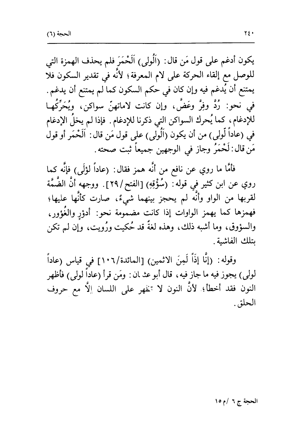 فأمّا ما روي عن نافع من أنّه همز فقال: عادا لؤلى فإنّه كما روي عن ابن كثير في قوله: سؤقه [الفتح/ 29]. ووجهه أنّ الضّمّة لقربها من الواو وأنّه لم يحجز بينهما شيء، صارت كأنّها عليها، فهمزها كما يهمز الواوات إذا كانت مضمومة نحو: أدؤر والغئور، والسؤوق، وما أشبه ذلك، وهذه لغة قد حكيت ورويت، وإن لم تكن بتلك الفاشية.