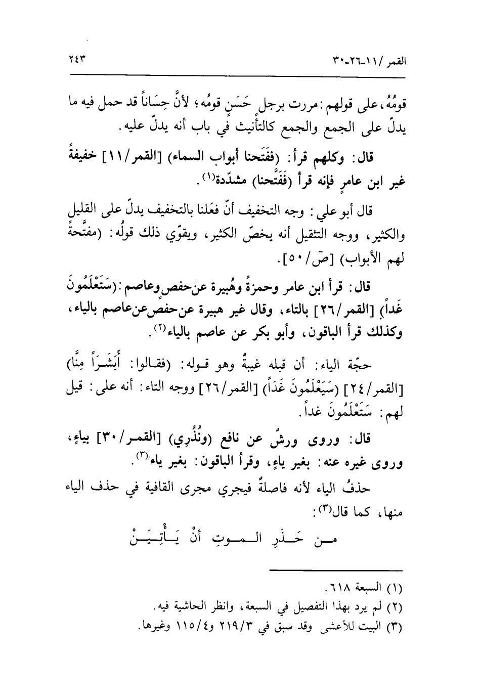 قال: قرأ ابن عامر وحمزة وهبيرة عن حفص وعاصم: ستعلمون غدا [القمر/ 26] بالتاء، وقال غير هبيرة عن حفص عن عاصم بالياء، وكذلك قرأ الباقون، وأبو بكر عن عاصم بالياء «2» حجّة الياء: أن قبله غيبة وهو قوله: فقالوا: أبشرا منا [القمر/ 24] سيعلمون غدا [القمر/ 26] ووجه التاء: أنه على: قيل لهم: ستعلمون غدا.