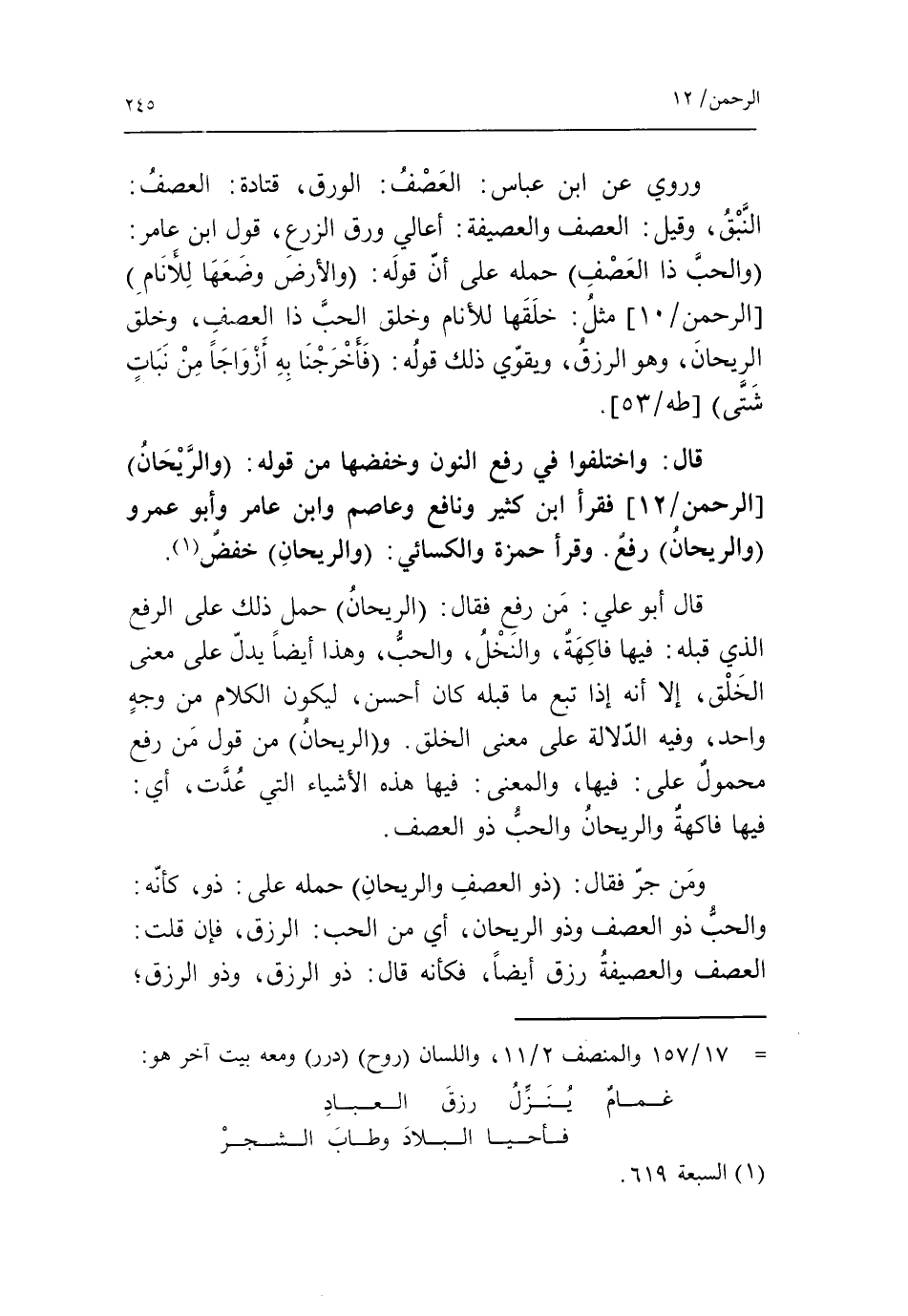 قال أبو علي: من رفع فقال: الريحان حمل ذلك على الرفع الذي قبله: فيها فاكهة، والنخل، والحبّ، وهذا أيضا يدلّ على معنى الخلق، إلا أنه إذا تبع ما قبله كان أحسن، ليكون الكلام من وجه واحد، وفيه الدّلالة على معنى الخلق. والريحان من قول من رفع محمول على: فيها، والمعنى: فيها هذه الأشياء التي عدّت، أى: