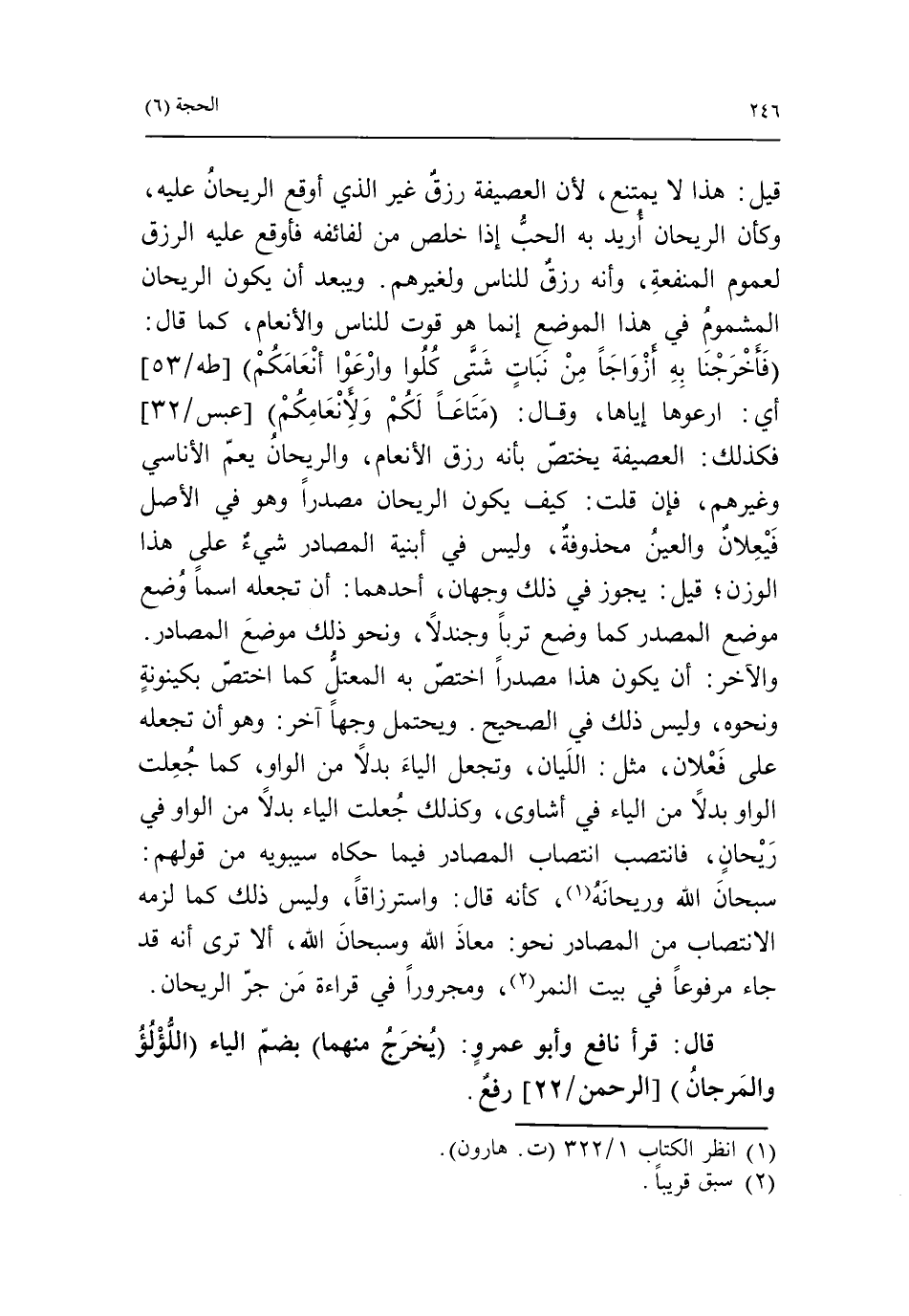 قيل: هذا لا يمتنع، لأن العصيفة رزق غير الذي أوقع الريحان عليه، وكأن الريحان أريد به الحبّ إذا خلص من لفائفه فأوقع عليه الرزق لعموم المنفعة، وأنه رزق للناس ولغيرهم. ويبعد أن يكون الريحان المشموم في هذا الموضع إنما هو قوت للناس والأنعام، كما قال: